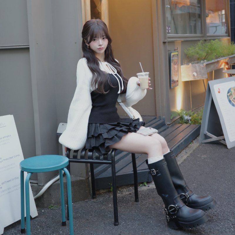 ボリュームフリルが腰回りを包み込み、リブニットの身頃が縦ラインを強調してスタイルアップ効果も◎✨