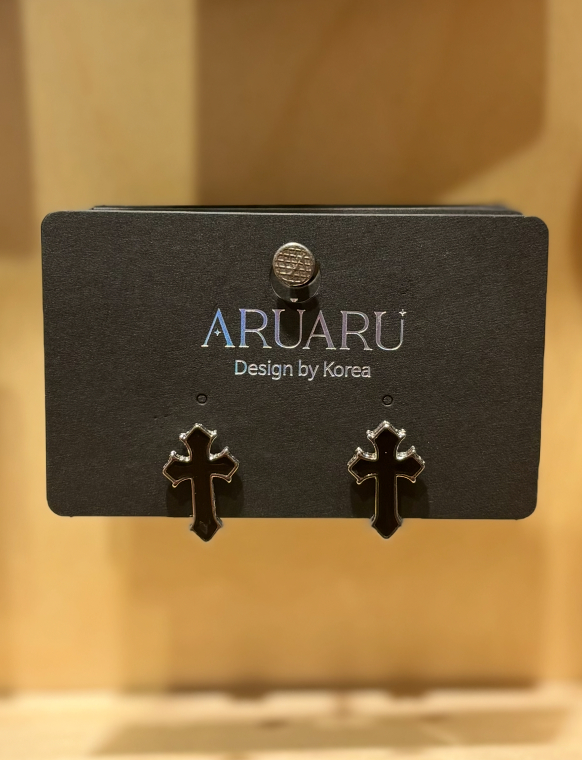 艶のあるブラックカラーが印象的なクロスモチーフピアス✝️❤︎
