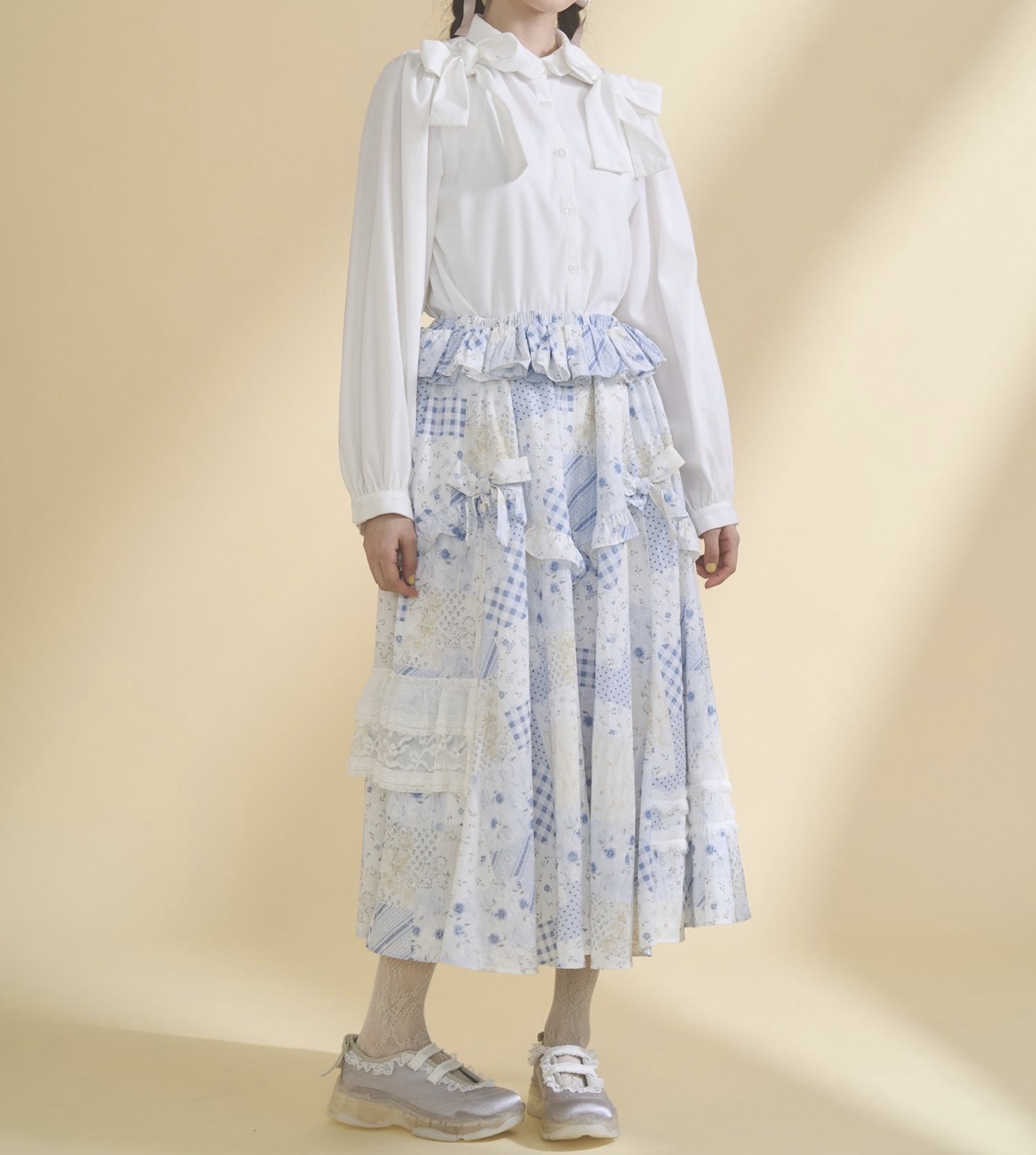 チェックと小花柄を組み合わせた、淡いトーンのパッチワーク風フレアスカート。