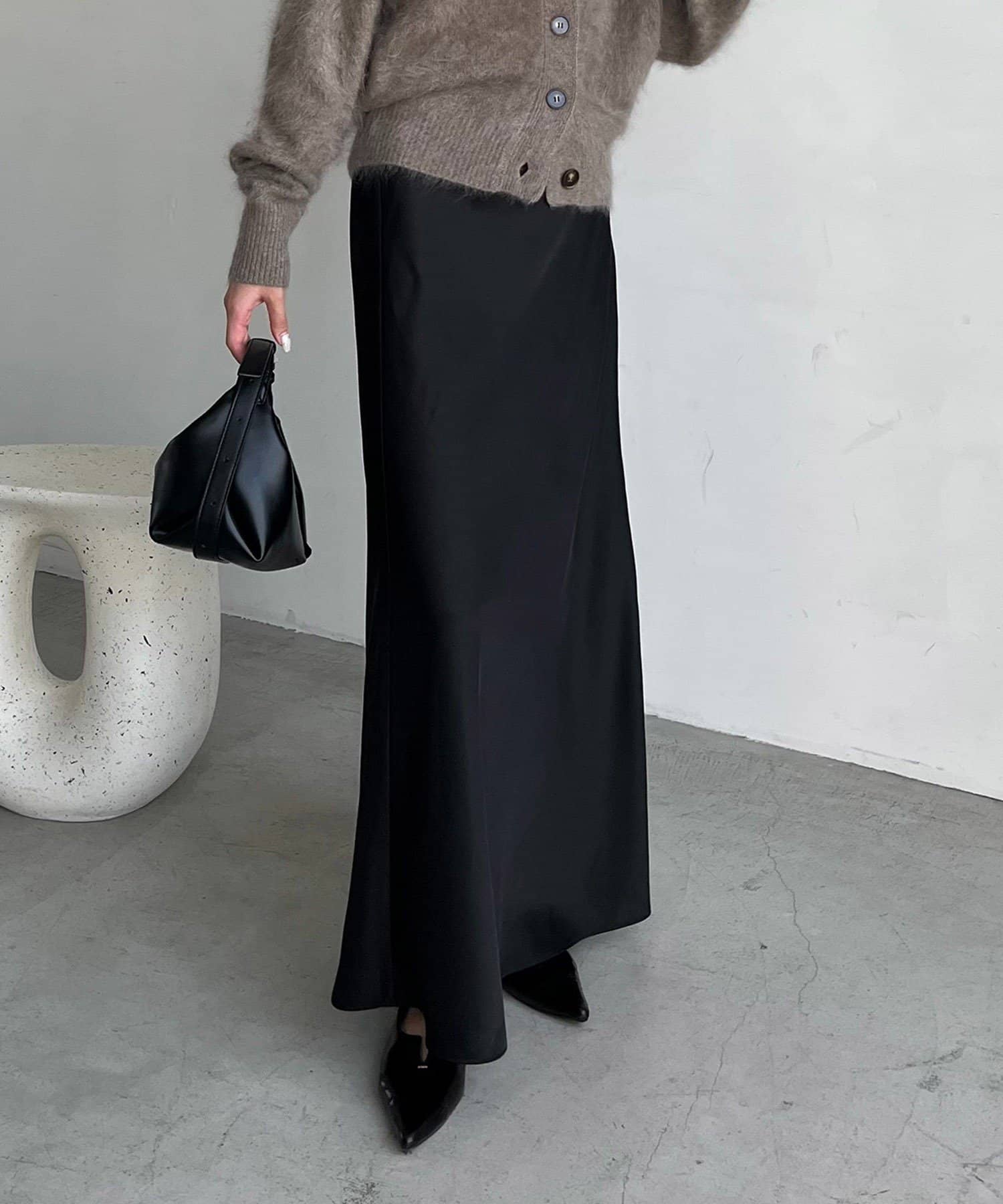 サテン素材が上品なアイテムでストンと落ちるAラインシルエットが綺麗✨