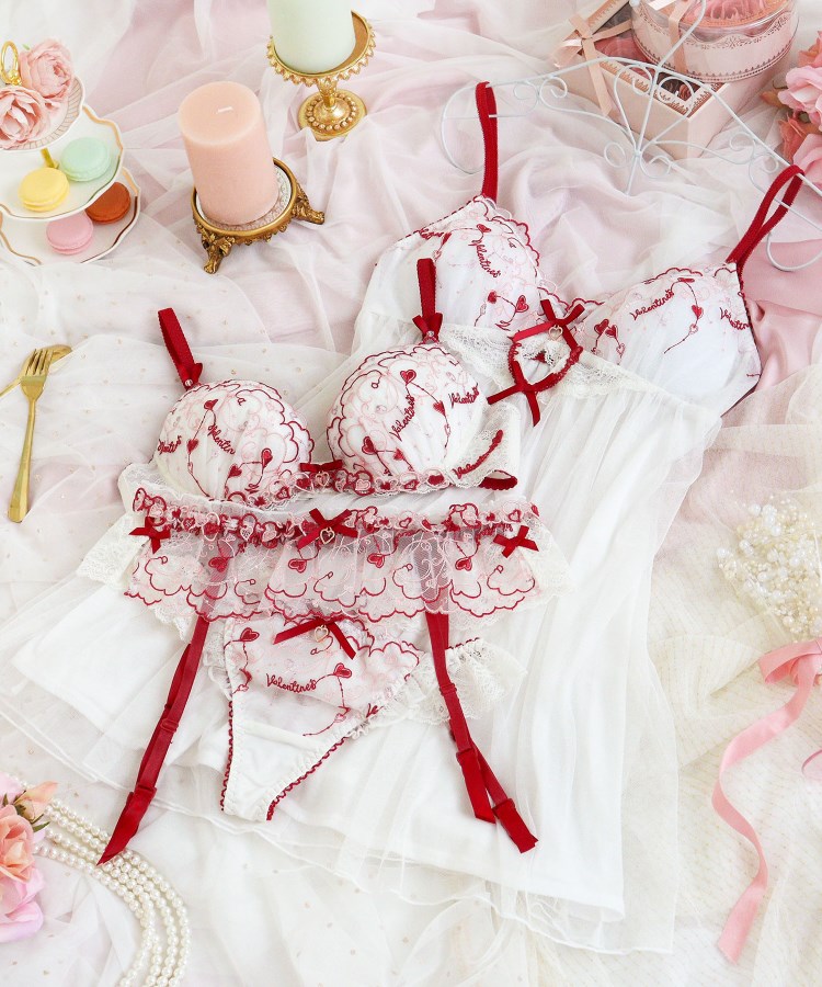 バレンタインの甘くときめく気持ちを遊び心たっぷりに表現した、リサマリのバレンタインシリーズです。レースにあしらわれた立体的な山型模様は、よく見ると愛らしいハート型のデザインに。1つ1つステッチを変えた小さなハートや、「Risa Magli」の文字をさりげなく散りばめて、特別感を詰め込みました。カップ下にはV字のカッティングとストレッチレースを、リボン中央にはハートのチャームと、バックスタイルにはきらめくガラスビーズをほどこして、心ときめくワンポイントに。カッティング部分には「Valentine」の文字をデザインした、オリジナリティあふれるアップリケもプラスしました。身生地はふんわり広がるチュール素材で、軽やかでキュートな印象に。胸いっぱいにハートがあふれる、バレンタインをHappyに楽しめるコレクションです。