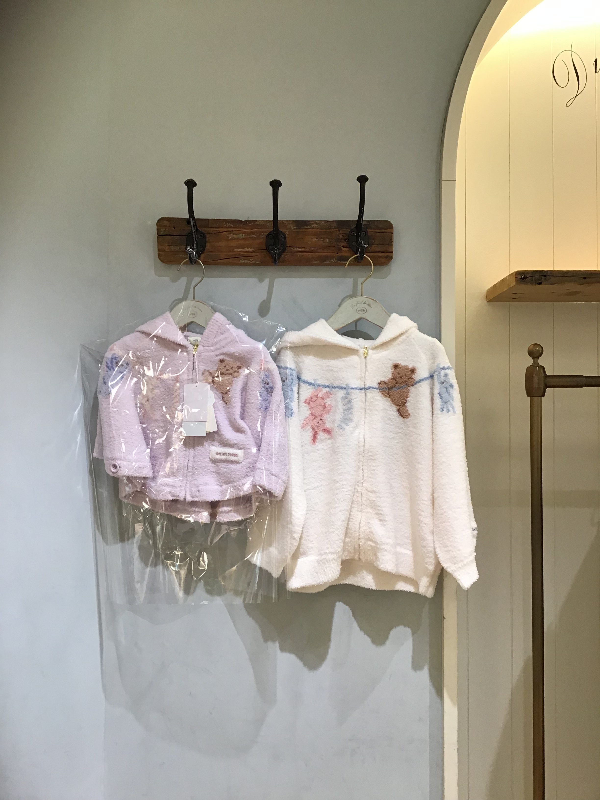 洗濯紐に留まったルームウェアやぬいぐるみたちの絵柄を、ジャガードで描いた‘エアリーモコ’素材のBABYポンチョ👶🏻💘フロントから背中までぐるりと入った絵柄の中には、ロープをよじのぼろうとする愛らしいベアも混ざっています。フードとファスナー付きで、肌寒い時にさっと着せやすいデザイン。左裾にあしらったロゴ入りのモコテープも、ふんわりとした素材感を引き立てます✨色はオフホワイトとラベンダーをご用意💜