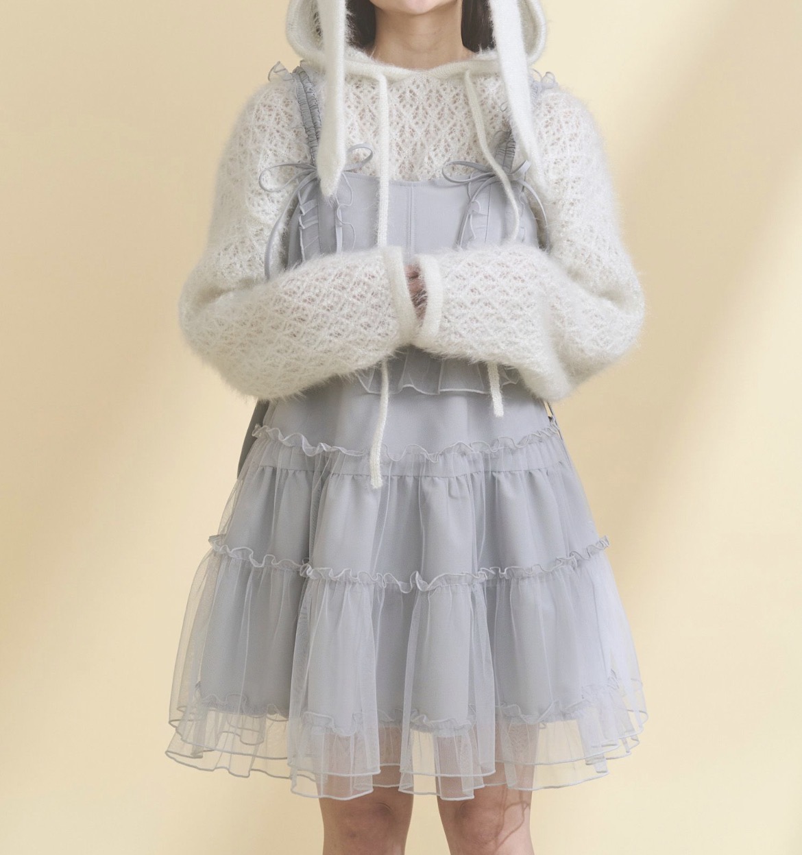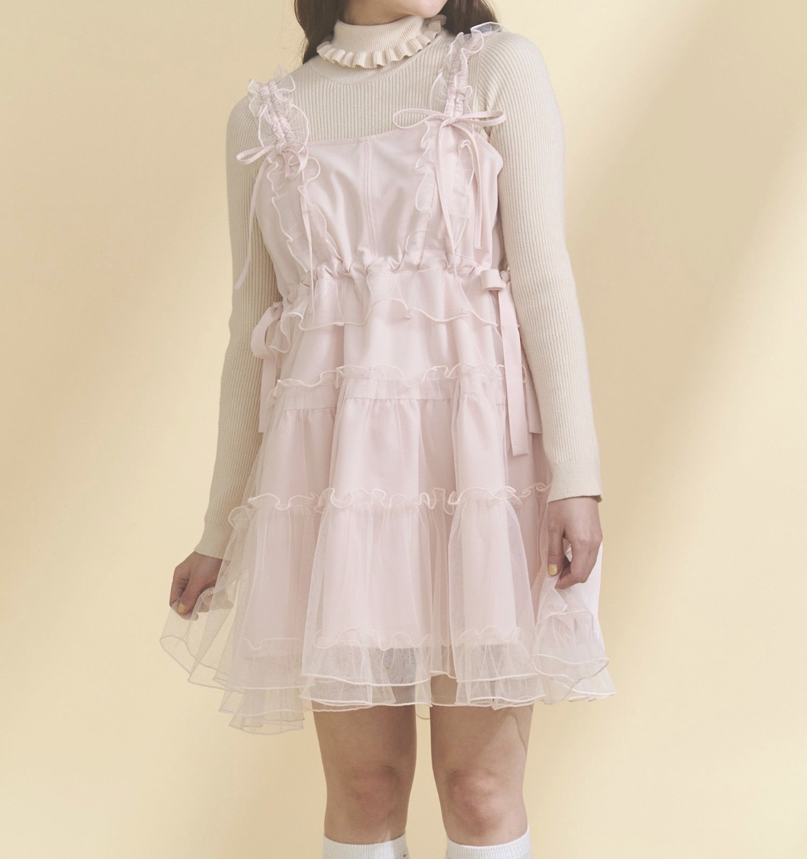 チュールフリルやリボンなど、繊細なディテールを散りばめたミニキャミワンピ―ス。