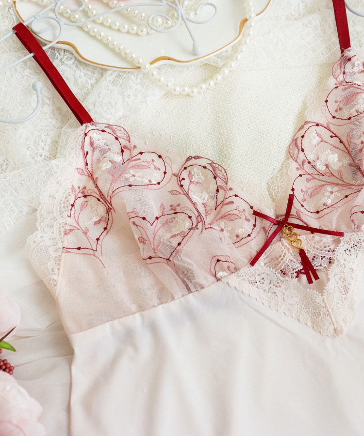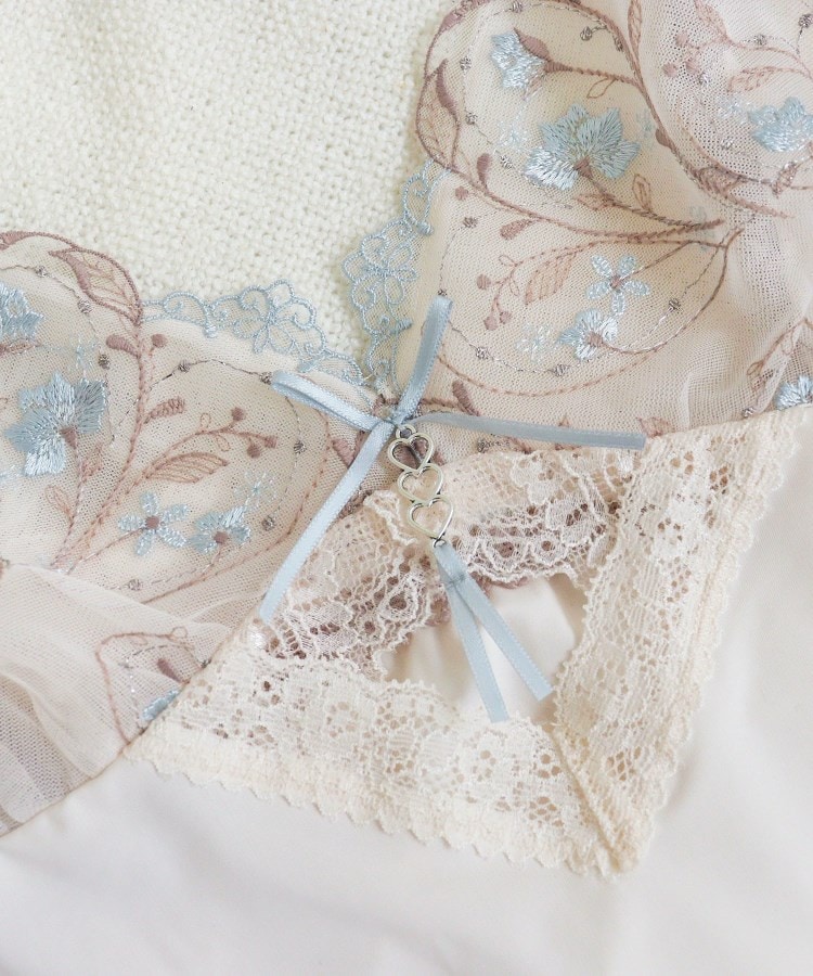 キラキラと輝く繊細な小花たちを散りばめた、リサマリのバレンタインシリーズです。レースにはさりげなくハートデザインを刺繍して、バレンタインのエッセンスを少し取り入れた、上品で清楚な印象に。普通糸とラメ糸、厚みのあるウーリー糸を使用することで、大人っぽくも豪華な柄行きに仕上がりました。フロントにはカッティングをほどこして、リボンにはタッセルをイメージした3連のハートチャームをあしらい、特別感を演出。脇からバックスタイルにかけてストレッチレースで切り替えて、細部まで心ときめくデザインをお楽しみいただけます。カラーはちょっぴり大人なスウィーツをイメージした、バレンタイン気分を盛り上げてくれるコレクションです。