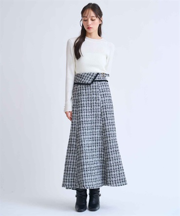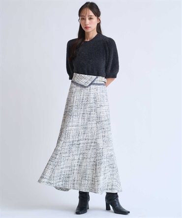 上品なツイード素材に、バックフレアで女性らしさをプラス。