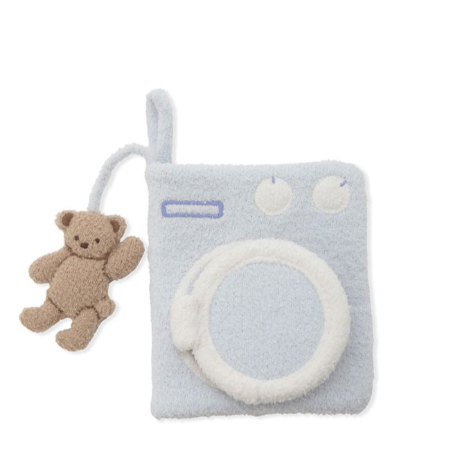 お洗濯されたぬいぐるみたちの絵柄をモチーフにした、‘エアリーモコ’素材のふんわりと優しい布絵本。揺れるぬいぐるみや洗濯機の扉を模した仕掛けなどが、赤ちゃんの好奇心を惹きつけます。同シリーズのルームウェアや雑貨と合わせて、ギフトにもおすすめです。