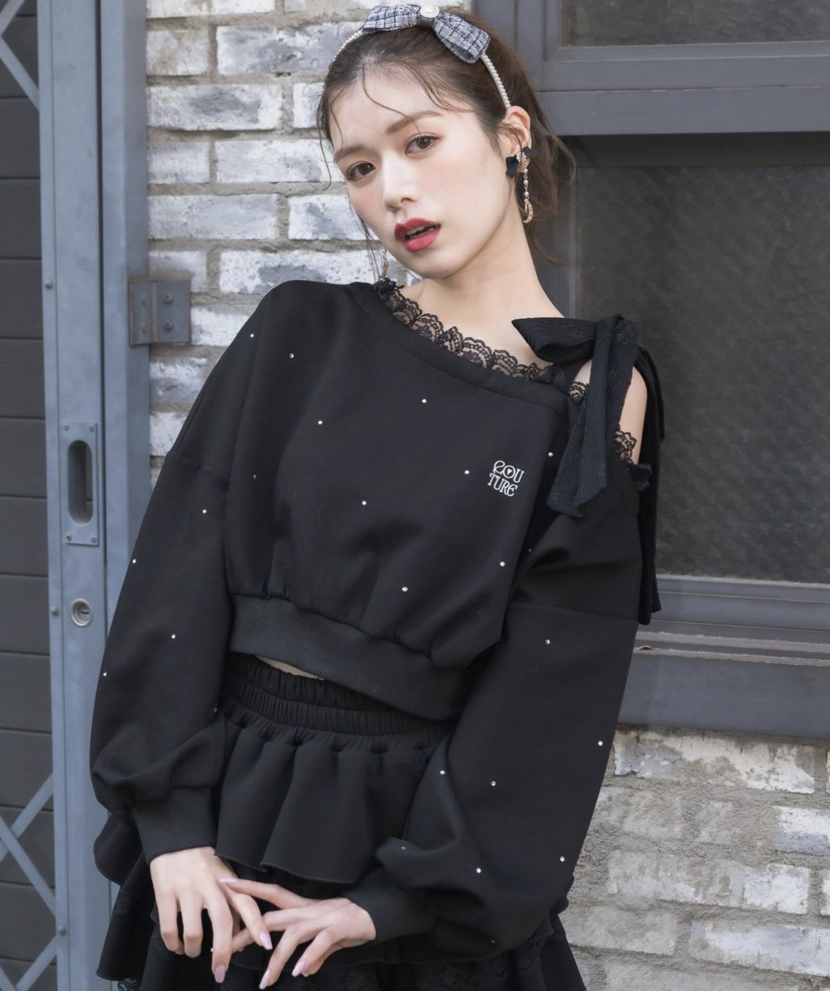カジュアルだけどお洒落映えできるスウェットトップス。ランダムなストーンが全体的に施されていて光の具合でキラキラと表情をプラスします。ワンショルはインナーのストラップを隠しやすい幅感、レースリボンがお顔まわりの可愛いアクセントになってくれます。ボトムもスウェットアイテムと合わせるとセットアップ風に着用いただけます。