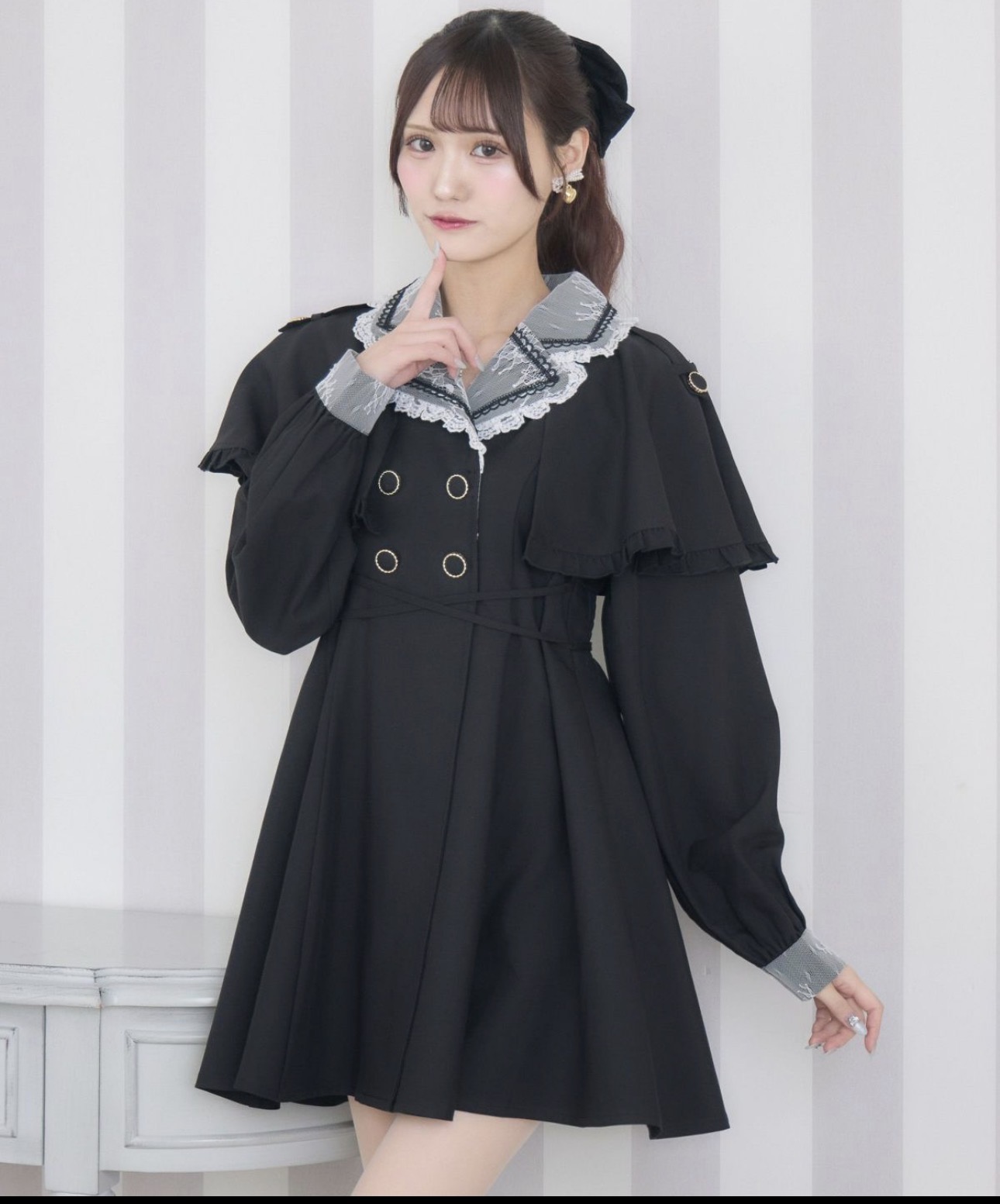 ケープデザイン風のショルダーラインがお育ち良さげな印象を与えるテーラードワンピース。ウエストクロスリボンでメリハリのあるシルエットに仕上げ、クラシカルな雰囲気ながらも上品で可愛らしいスタイルを演出します。フォーマルシーンからちょっとしたお出かけまで、幅広く活躍する一枚です。