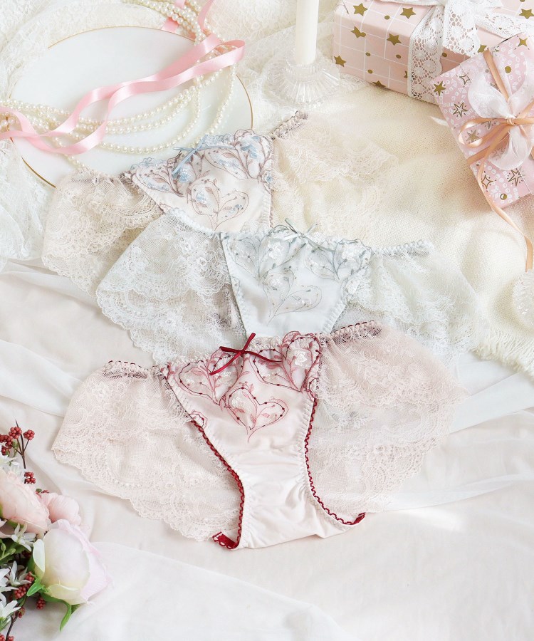 キラキラと輝く繊細な小花たちを散りばめた、リサマリのバレンタインシリーズです。フロントレースにはさりげなくハートデザインを刺繍して、バレンタインのエッセンスを少し取り入れた、上品で清楚な印象に。普通糸とラメ糸、厚みのあるウーリー糸を使用することで、大人っぽくも豪華な柄行きに仕上がりました。カラーはちょっぴり大人なスウィーツをイメージした、バレンタイン気分を盛り上げてくれるコレクションです。デザイン性は残しつつも、ラメ糸が肌に当たらないよう、仕様にもこだわりました。