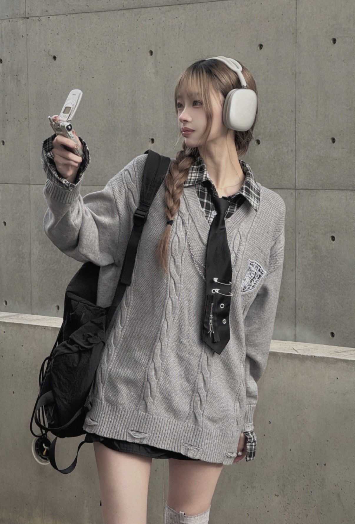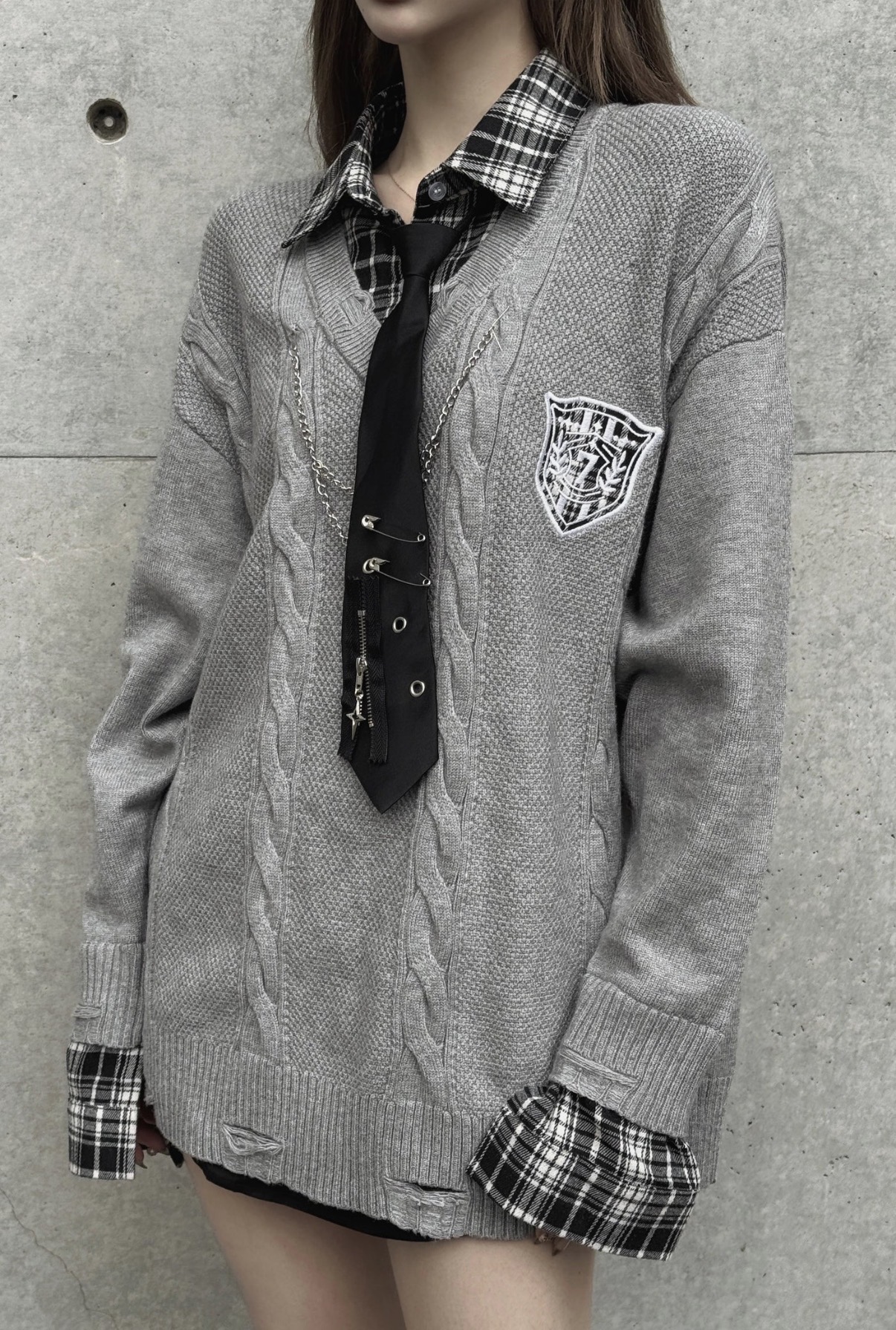 チェックシャツやブラウスをインナーに着て、ネクタイやチェーンなどのアクセサリーを合わせることで、地雷系や韓国アイドル風の洗練されたスクールガールスタイルが完成します。