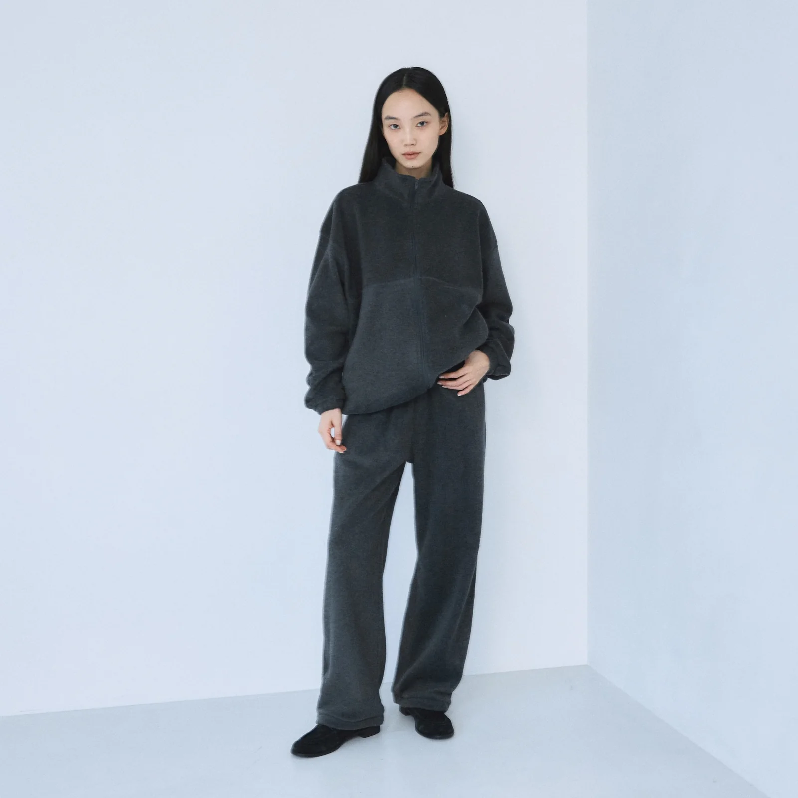首元まで包み込むハイネックと同色のコンシールファスナーを採用し、カジュアルながらもすっきりした印象に。