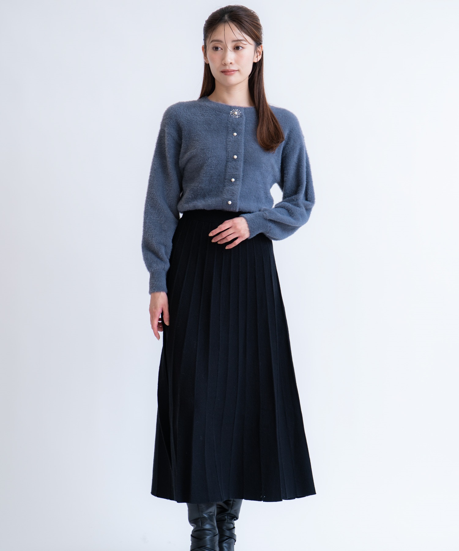 フェザートップスとプリーツ編みのニットスカートをドッキングしたワンピース。