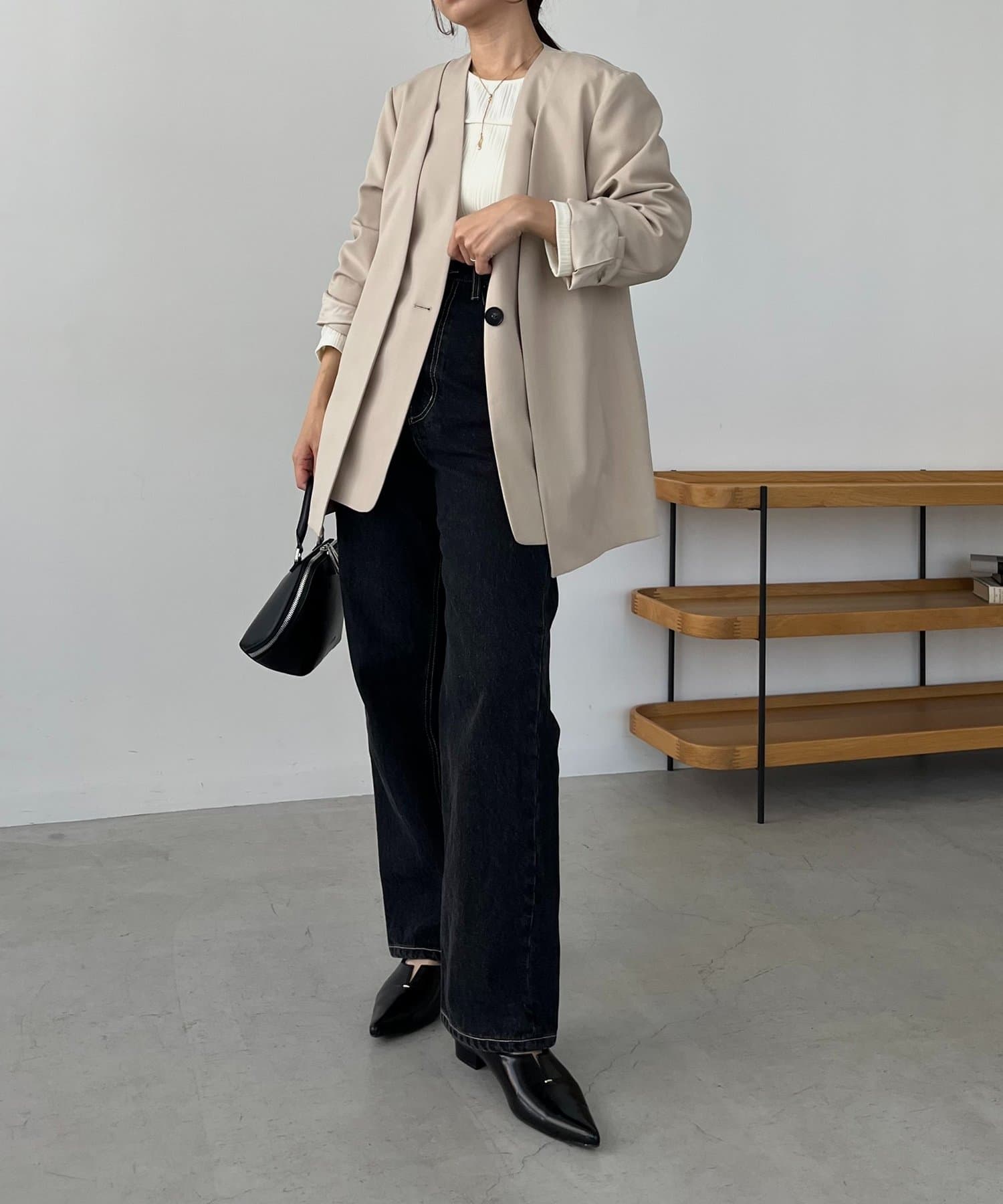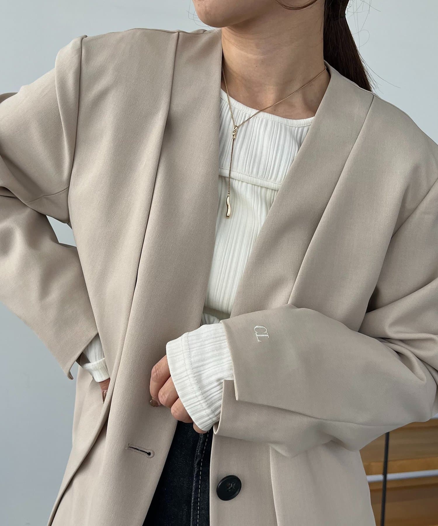 スリットが入っていてもノーカラーなのですっきりとしたシルエットに!
