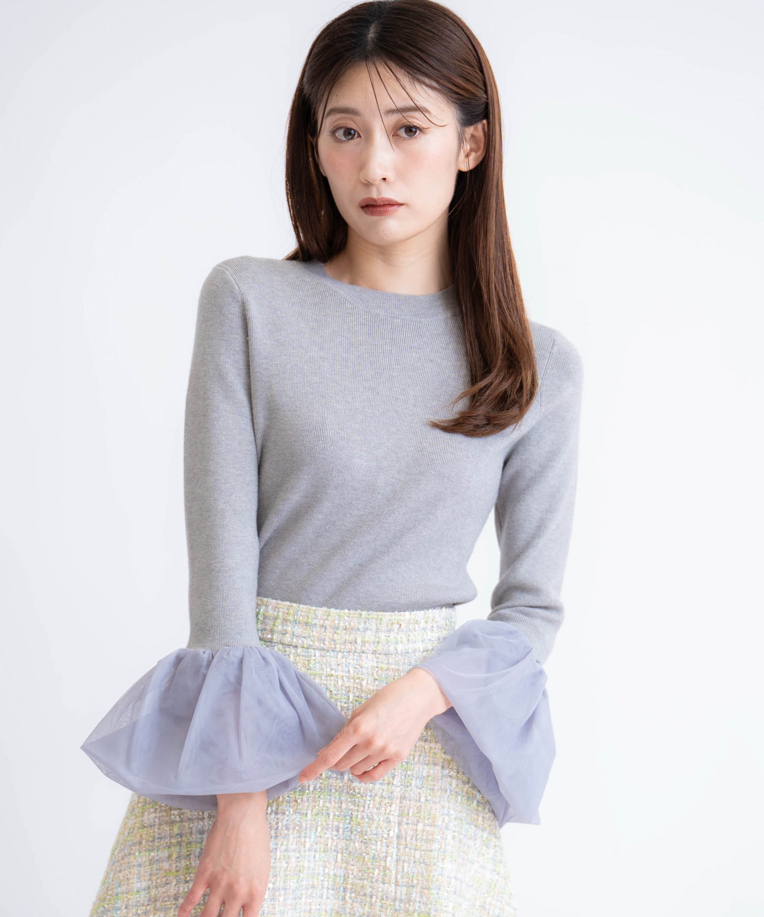 袖口にあしらったチュールが、さりげない華やかさを演出するニットトップス。