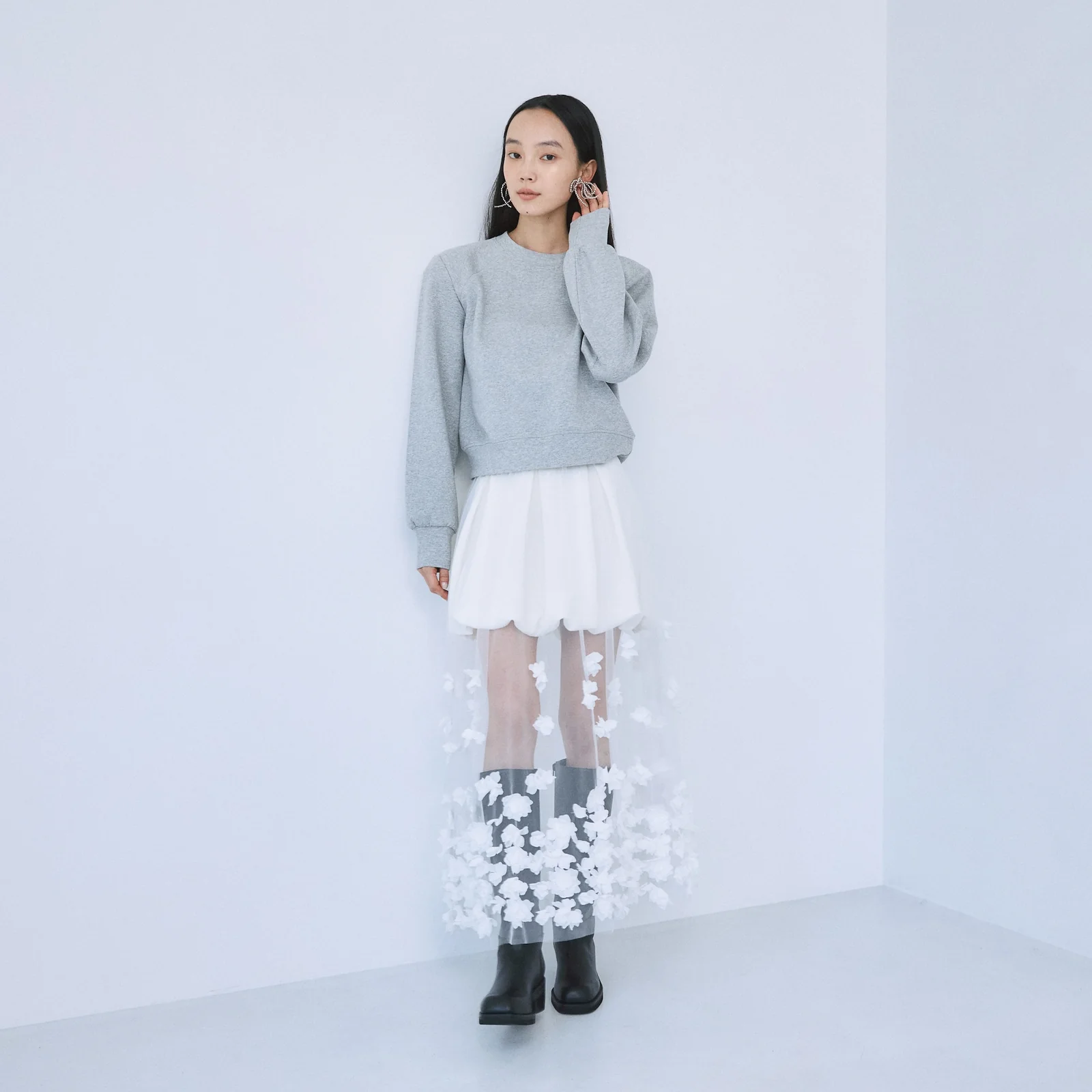 バルーンスカートと合わせることで、ショルダーパッドの存在感が引き立ち、女性らしさとモード感を両立したコーディネートも楽しめます。