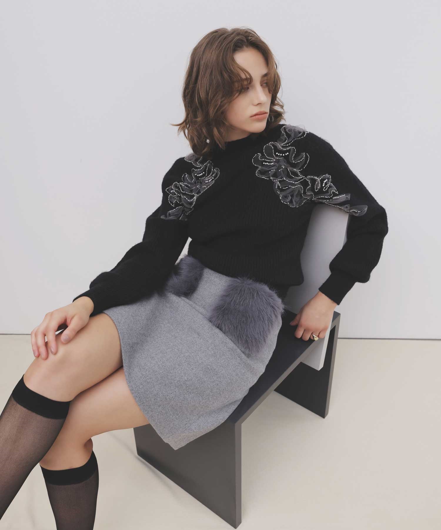 暖かみのある素材を使用したミニスカート。