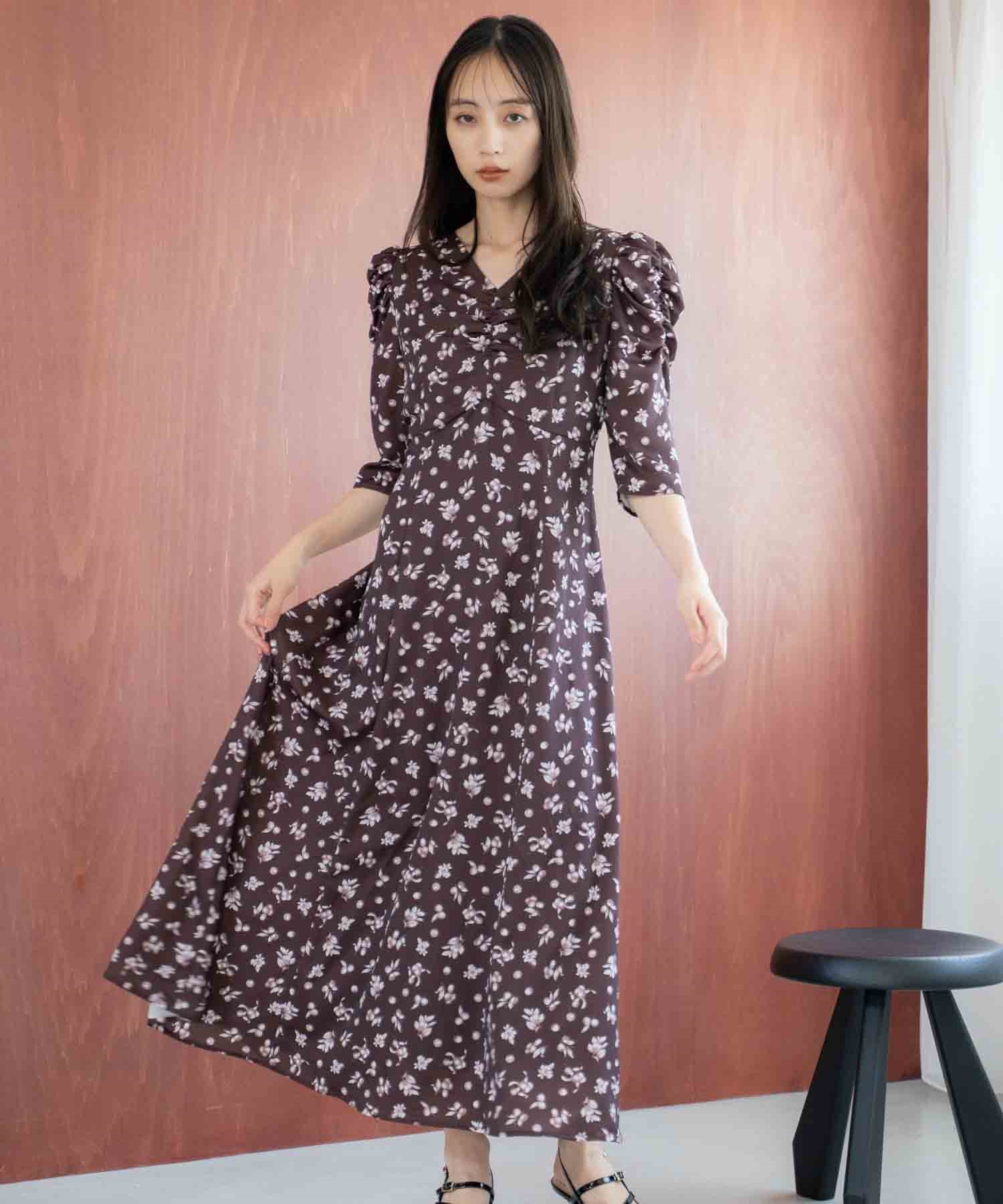 胸元とウエストのシャーリングでスタイルアップ効果も。