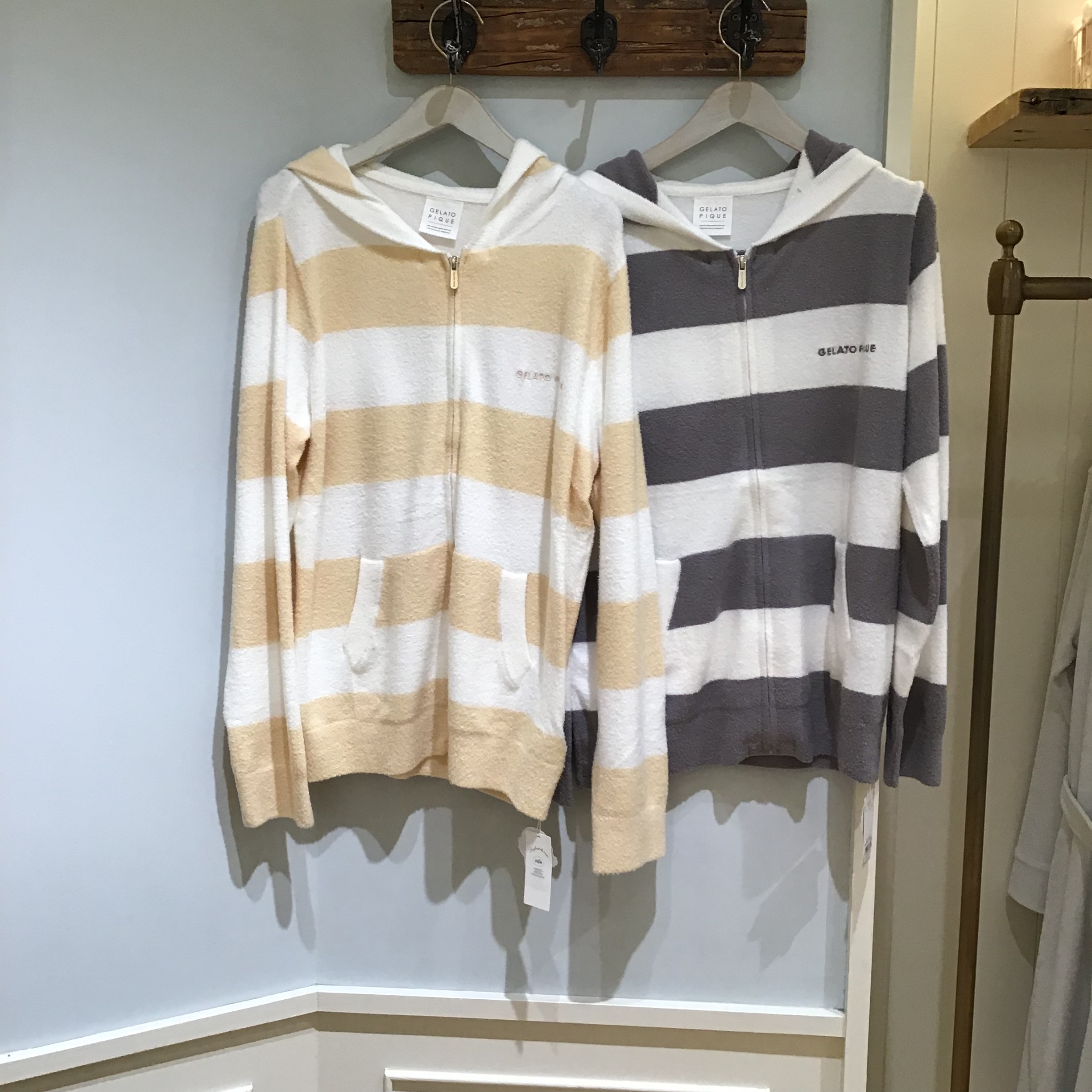 なめらかな薄手ニット‘スムーズィー’素材の定番2色ボーダーシリーズです。胸元にロゴ刺繍を入れたジップパーカは、1枚でも羽織りとしても重宝するアイテム。