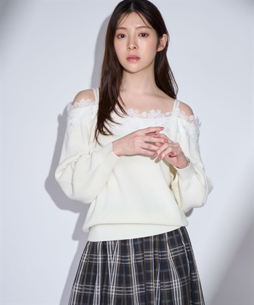 繊細なレースがデコルテを彩る、トレンド感たっぷりのオフショルダーニット。