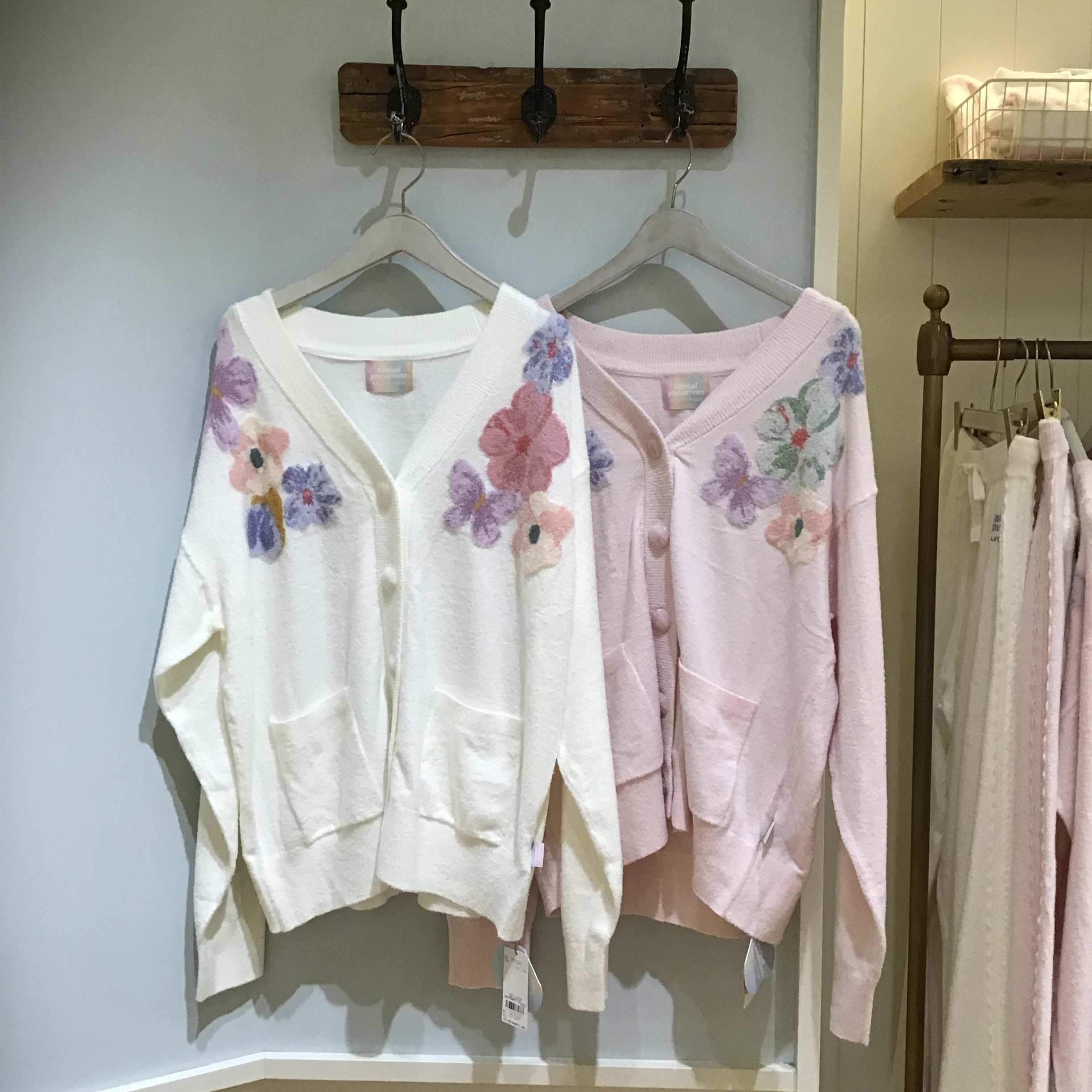 和菓子をモチーフとしたパステルカラーの花や蝶の柄は優しいカラーリングがポイントです!ゆったりとしたサイズ感でデイリーにお楽しみいただける1枚です。左袖口にはロゴ刺繍入り🎶
