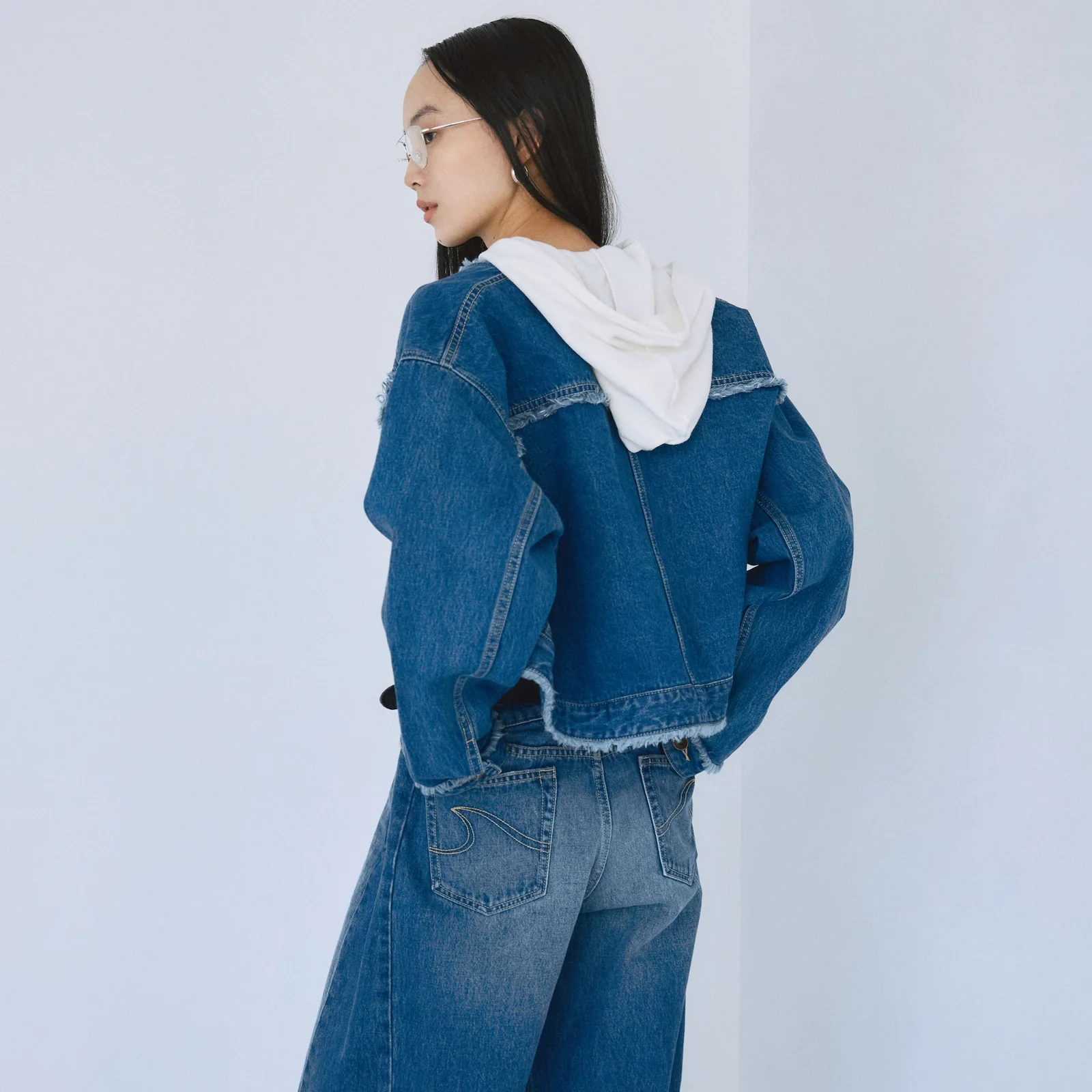 首元・ポケット・裾・袖口には短めのフリンジ加工を施し、デニムながらも女性らしい表情に。