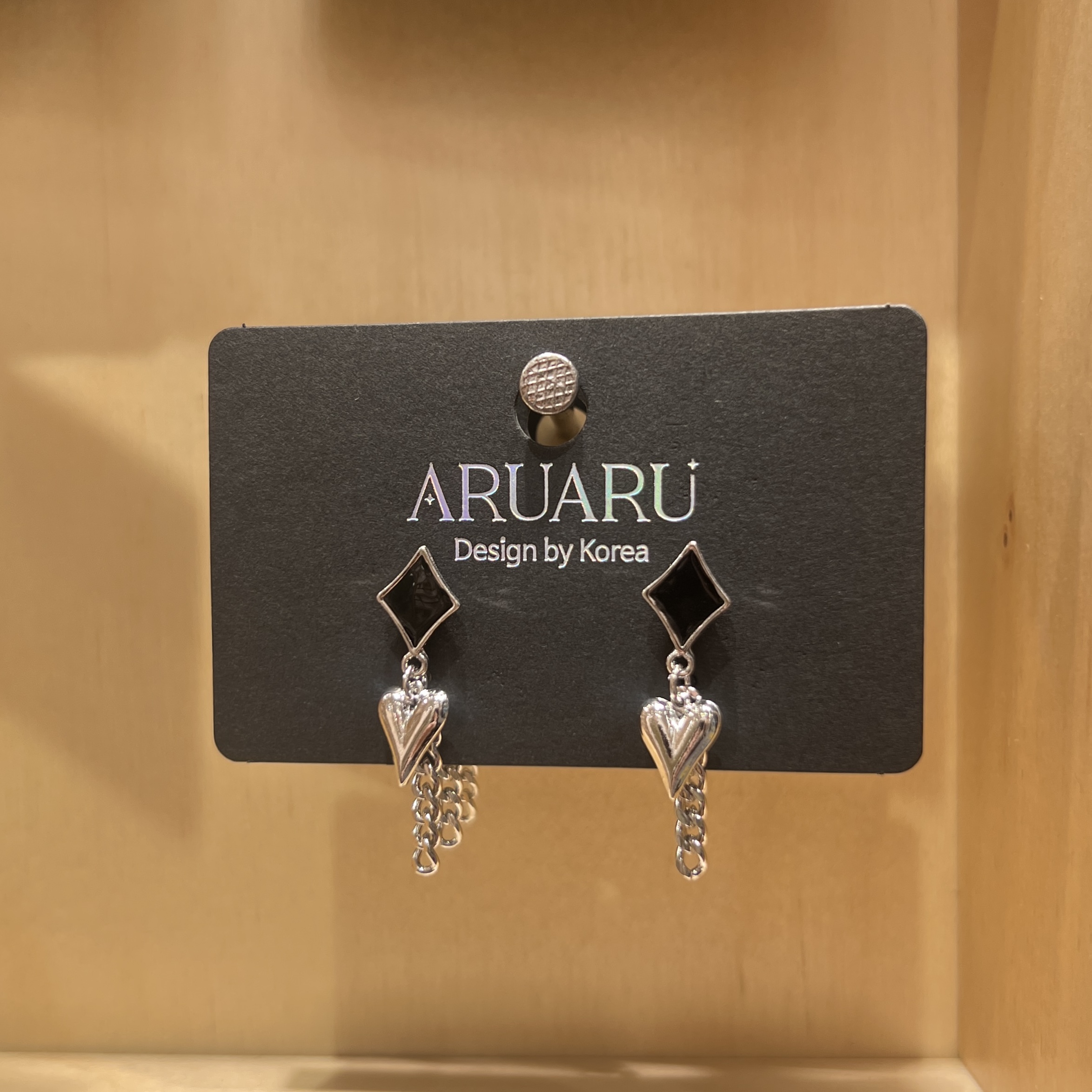 ブラックカラーのスクエアモチーフに、立体感のあるシルバーハートとチェーンを組み合わせたデザインピアスです🖤