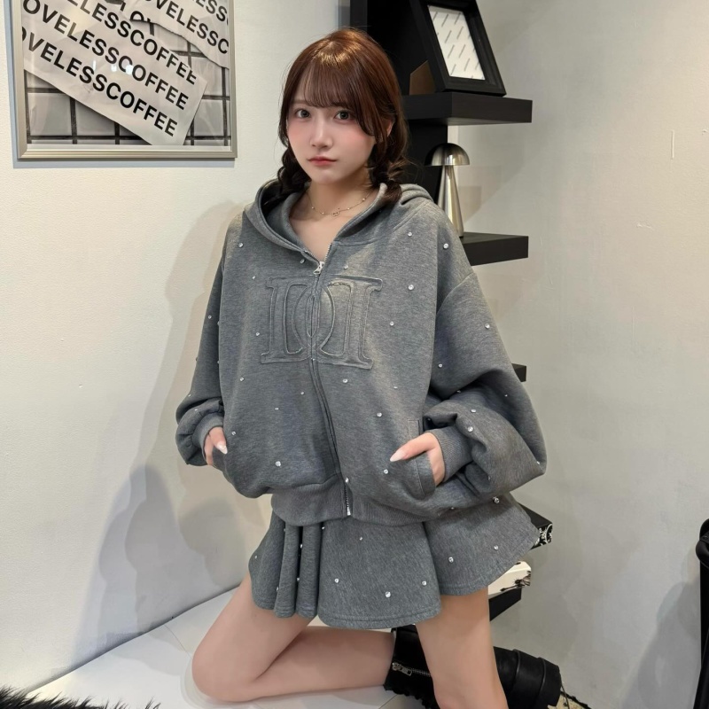 フロントのDDロゴ刺繍と全体に散りばめたビジューが目を惹く、華やかスウェットセットアップ♡