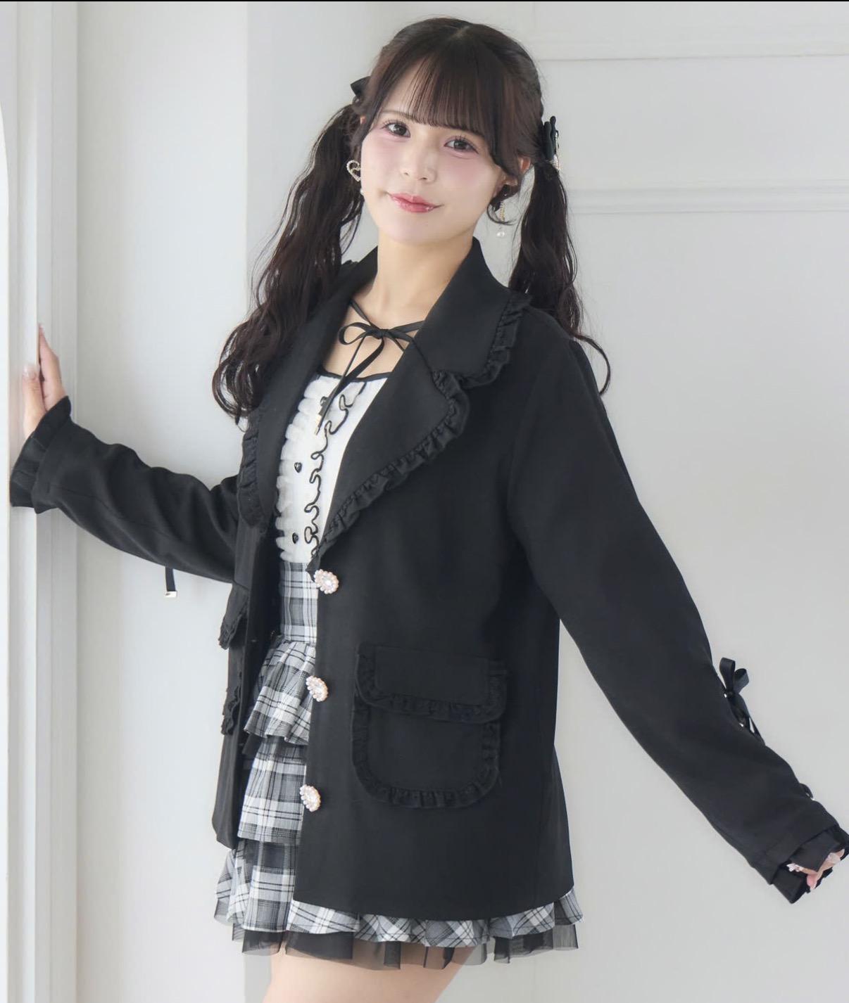 袖口のレースアップデザインとハート型ビジューボタンが、特別感と可愛さを添えるテーラードジャケット。程よいサイジングで、きちんと感と女性らしいシルエットを両立。春先のスプリングジャケットとしても活躍する一枚です。