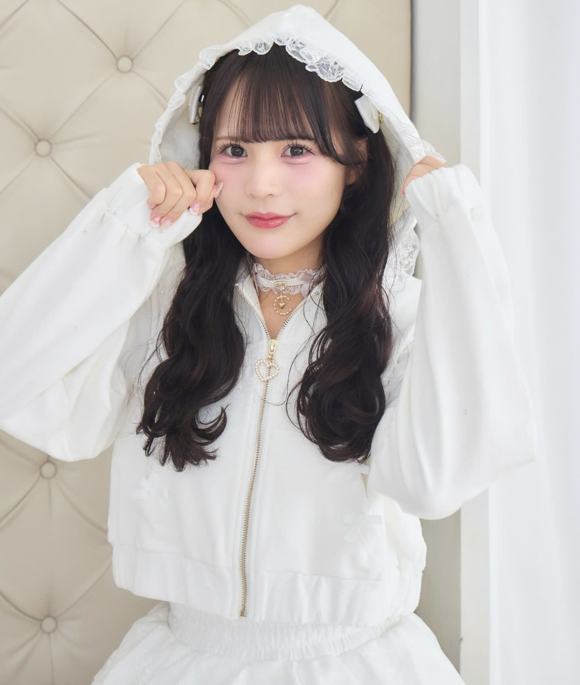 こだわりを詰め込んだ、ROJITAらしいディテール重視のショートパーカー♡ラインストーンを散りばめ、きらめくデザインがコーデを格上げ◎ハート型のファスナーチャームや、ポケットにあしらったリボン装飾が甘さを添えます。コンパクトな丈感で、ワンピースやボリュームボトムとも好バランス。