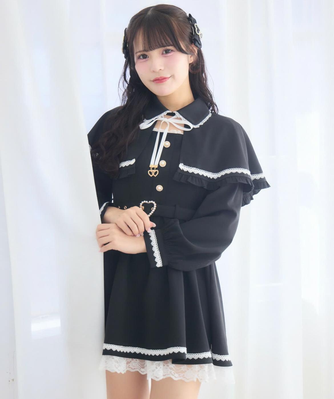 クラシカルでロマンティックな雰囲気漂うケープワンピース。ハートのバックルベルトがウエストをさりげなく引き締め、可愛らしいアクセントに。裾から覗くオーバーレースと配色のコントラストが、優雅でフェミニンな印象をプラスします。