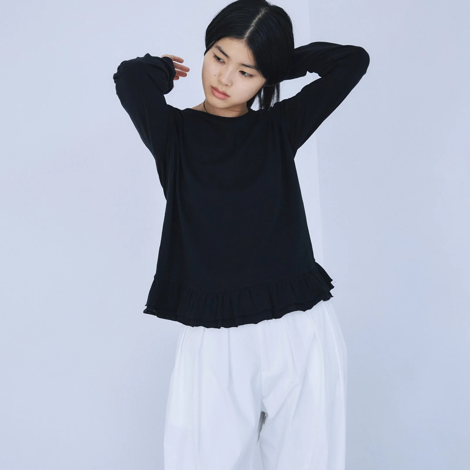 シンプルなクルーネックのボディに、裾のさりげないフリルがアクセントをプラス。