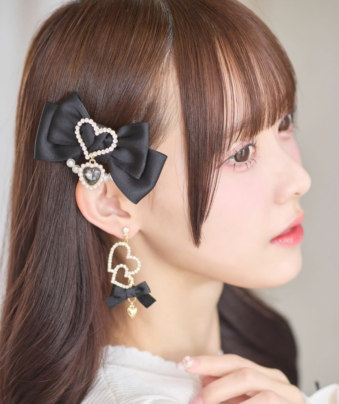 ハートビジュとパール付きのリボンクリップセット♡厚みのあるリボンが存在感たっぷりで、ヘアアレンジのアクセントにぴったりです。パールチェーンが華やかさとクラス感をプラスし、普段のスタイルもぐっと格上げ。デイリーから特別な日までヘビーユースできる一押しアイテムです。