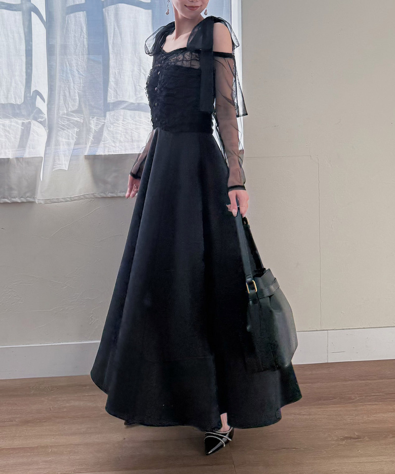 上身部分にはたっぷりとギャザーを寄せ表情をプラス、ショルダーリボンデザインもアクセントとなり目を惹くポイントです。
