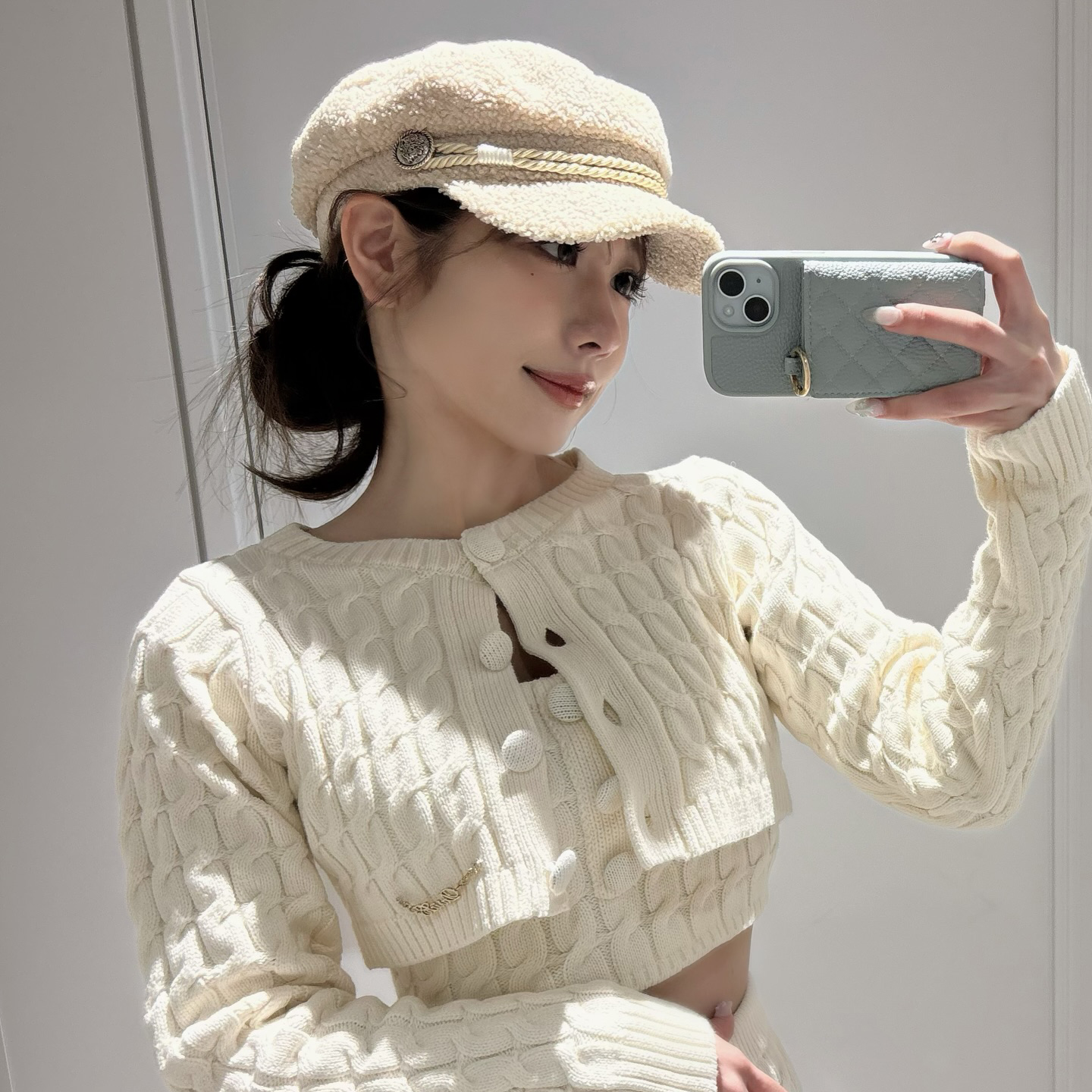 レトロなくるみボタンとケーブル編みが目を惹く、キャミ・カーディガン・ミニスカートの3ピースセット🧶🎀
