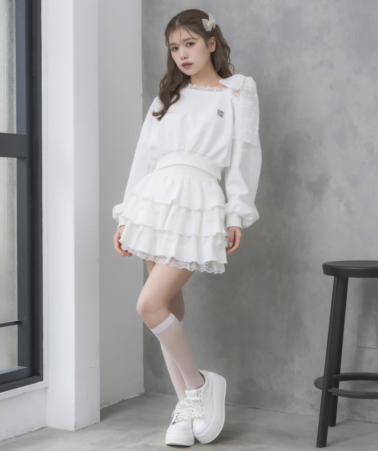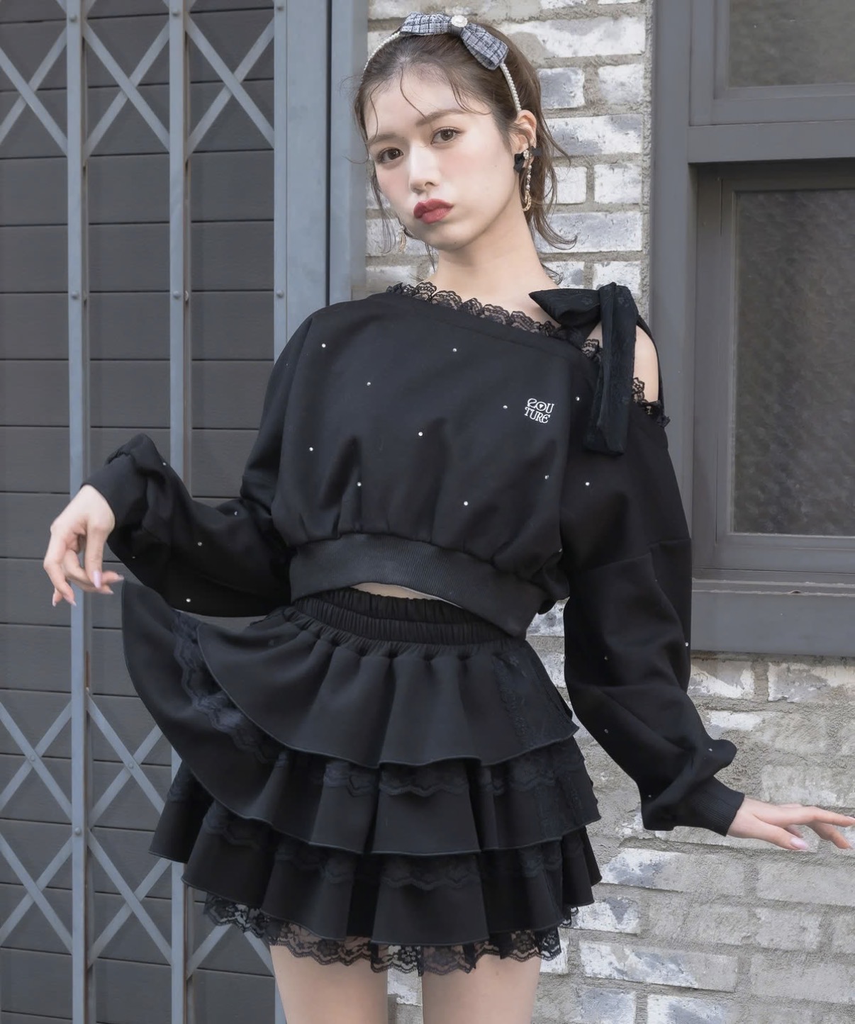 カジュアルだけどお洒落映えできるスウェットトップス。ランダムなストーンが全体的に施されていて光の具合でキラキラと表情をプラスします。ワンショルはインナーのストラップを隠しやすい幅感、レースリボンがお顔まわりの可愛いアクセントになってくれます。ボトムもスウェットアイテムと合わせるとセットアップ風に着用いただけます。