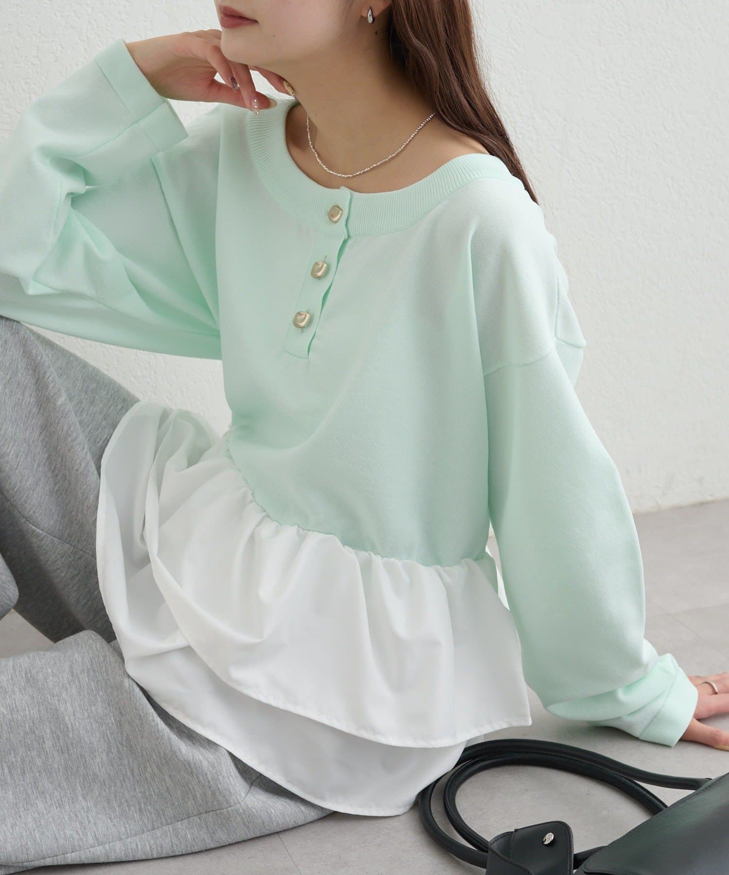 デニムやスラックス合わせでペプラムのあまさを抑えた大人カジュアルスタイルにも着ていただけます!