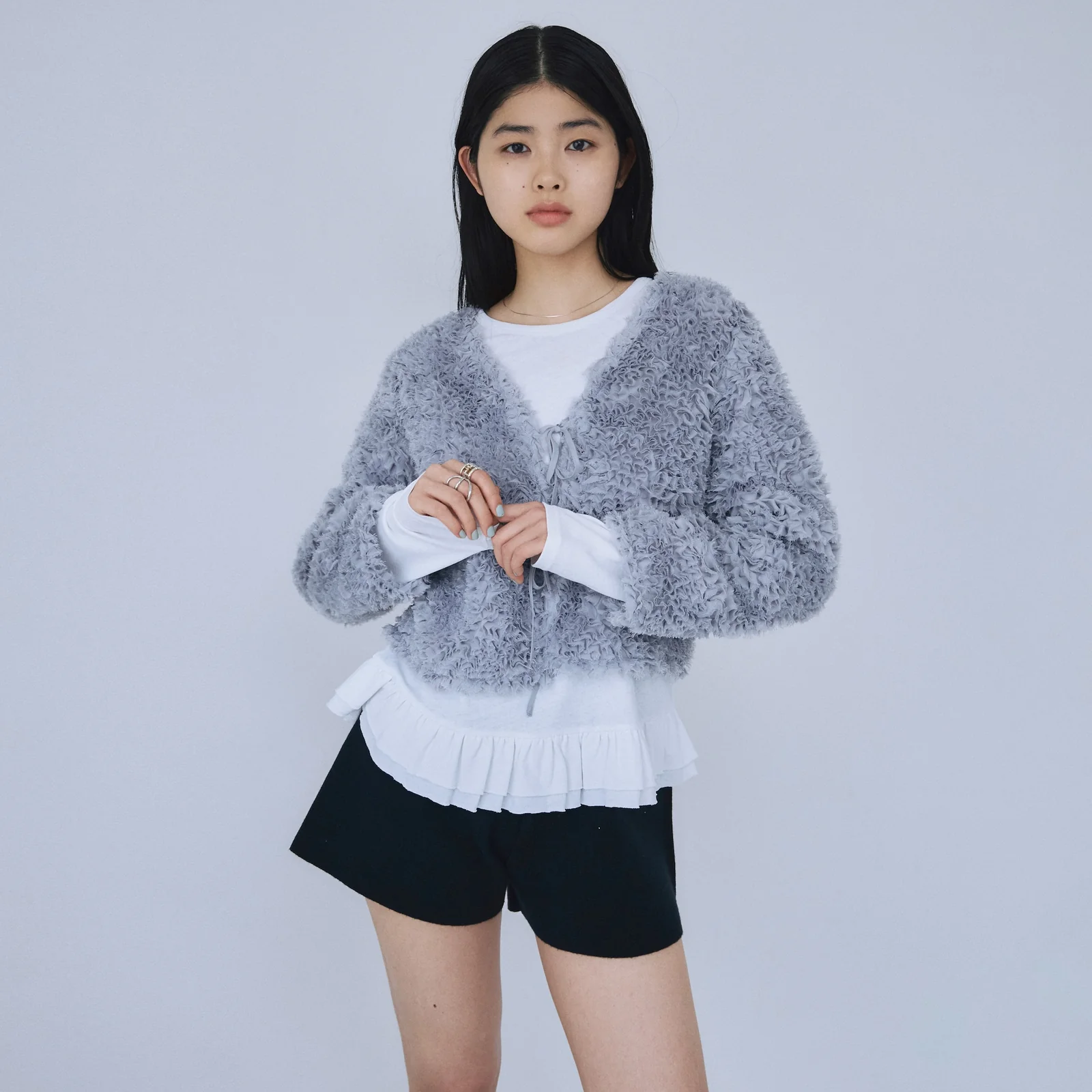 深めのVネックが顔まわりをスッキリと見せ、フロントの手結びリボンが軽やかなリズムを演出します。