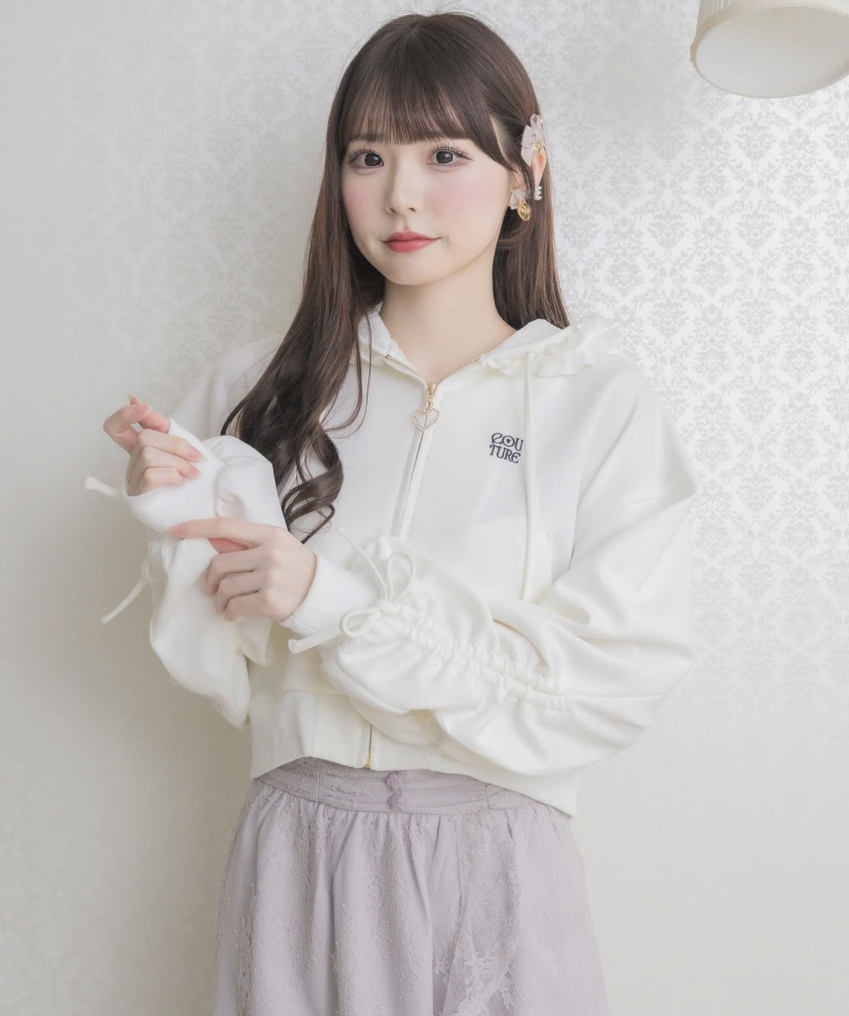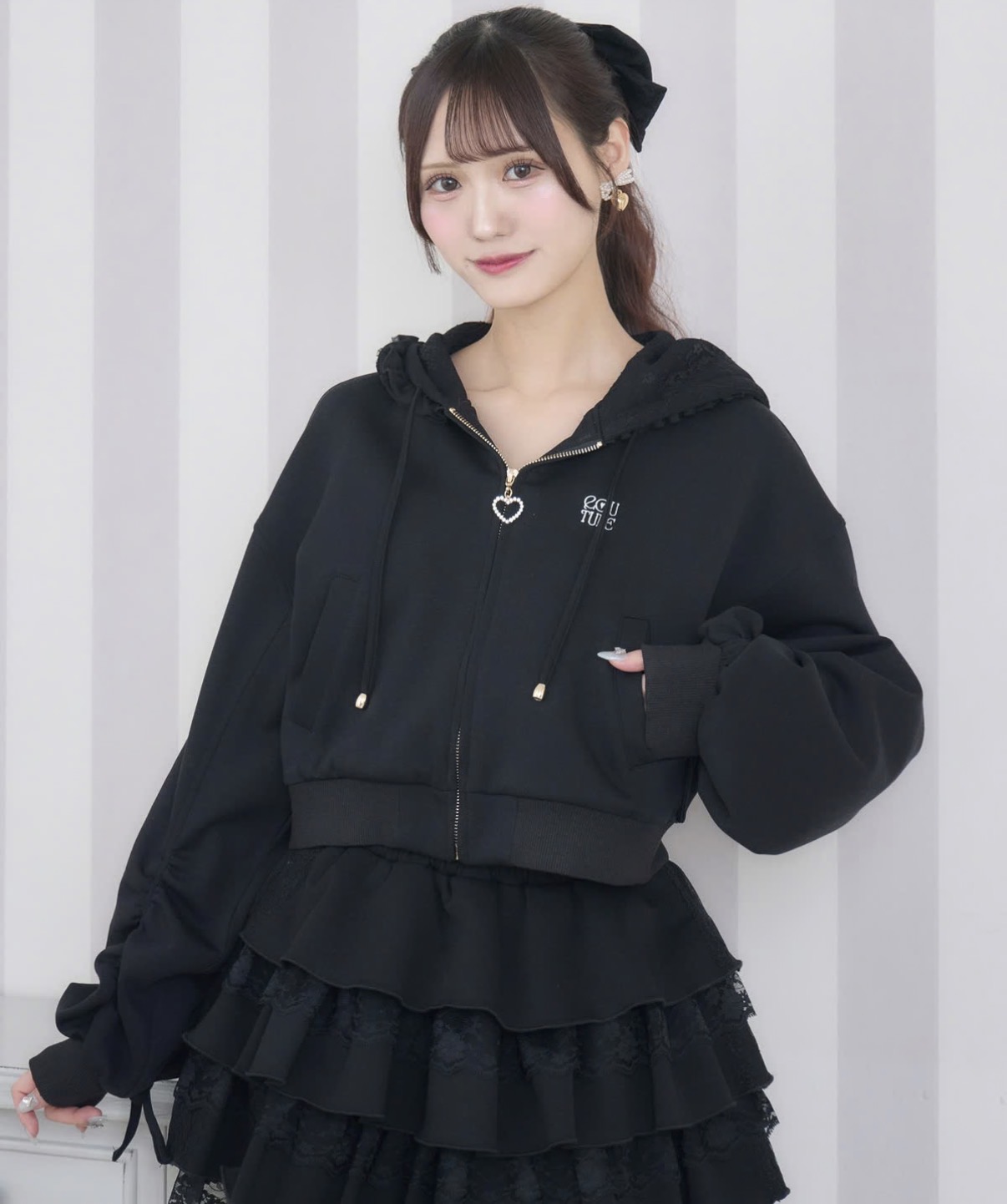 フードにあしらったフリルが印象的な、フェミニンムード漂うスウエットパーカー。袖のドロストデザインがさりげないアクセントとなり、シルエットのアレンジも楽しめます。程よく短めの丈感で、スタイルアップ効果も◎ハイソックスやミニボトムと合わせたトレンド感のあるスタイリングがおすすめです♪