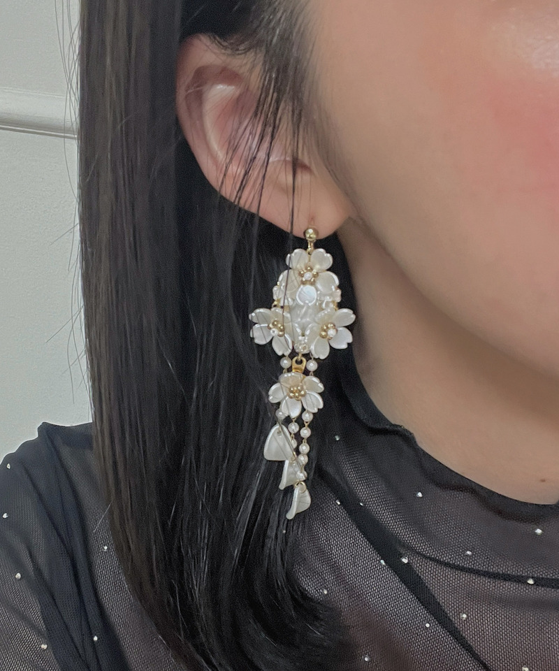 パールチェーンやビジュー、フラワーパーツが存分にあしらわれたボリュームたっぷりのピアス。