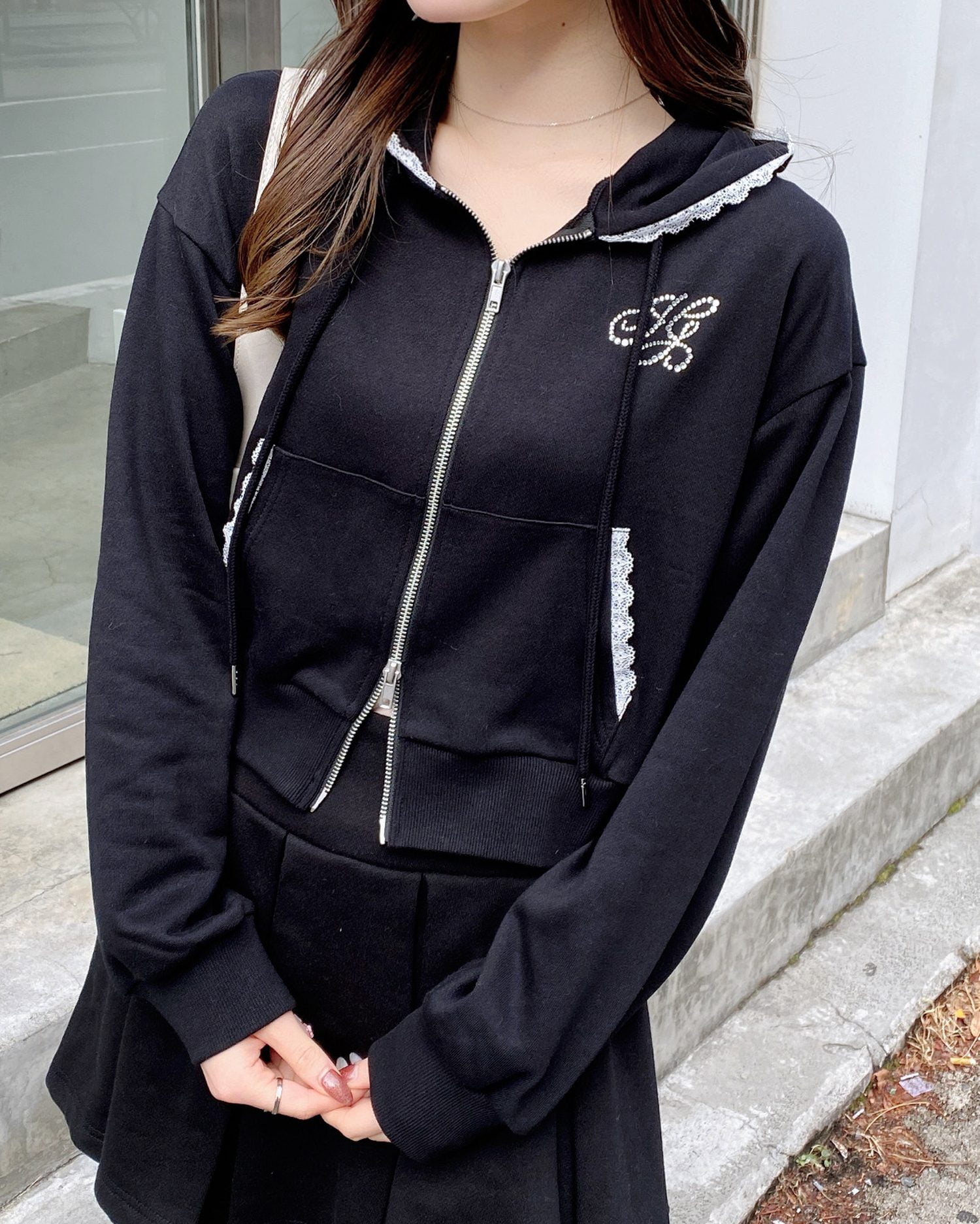 ⚫︎1261-100164 レース付胸ロゴスウェットショートジップパーカー(セットアップ対応)