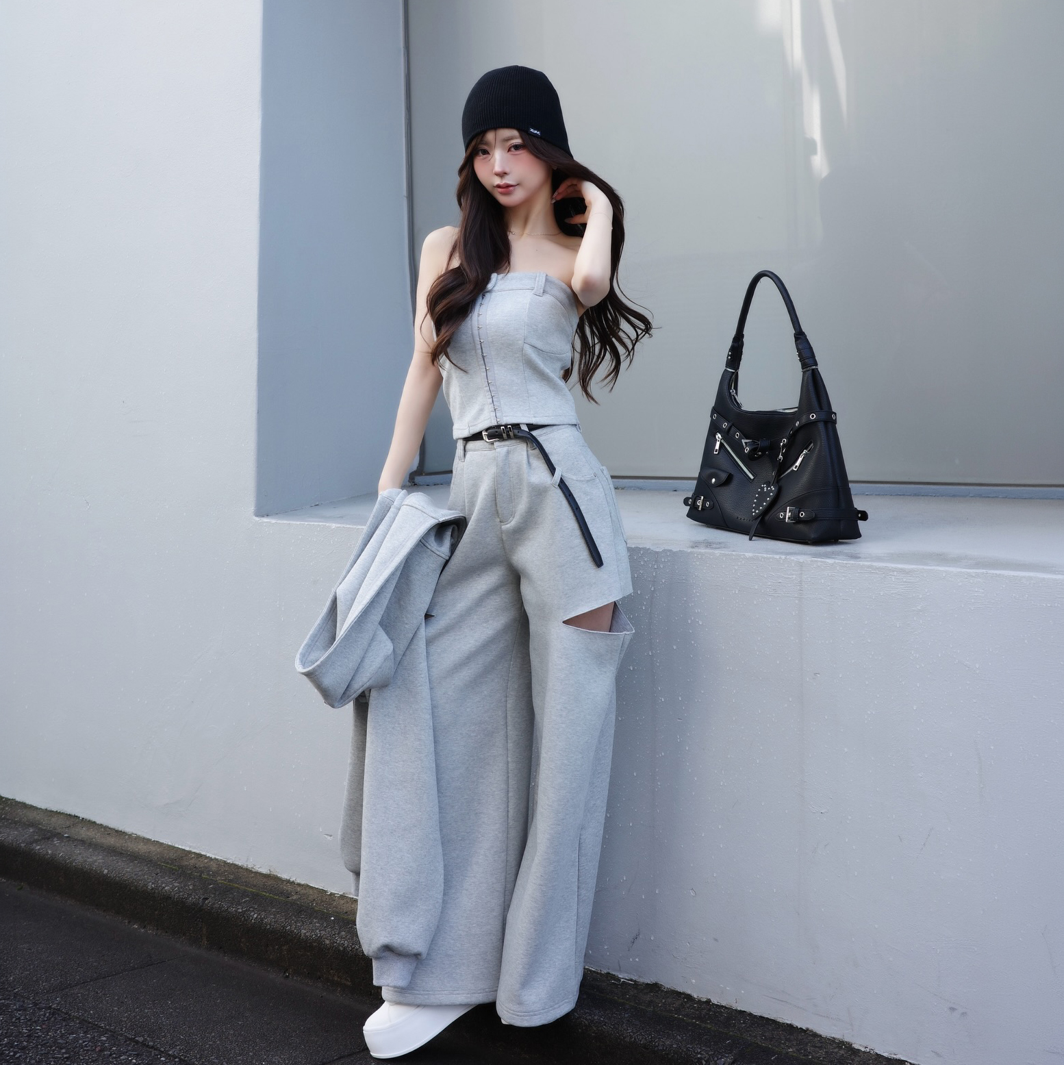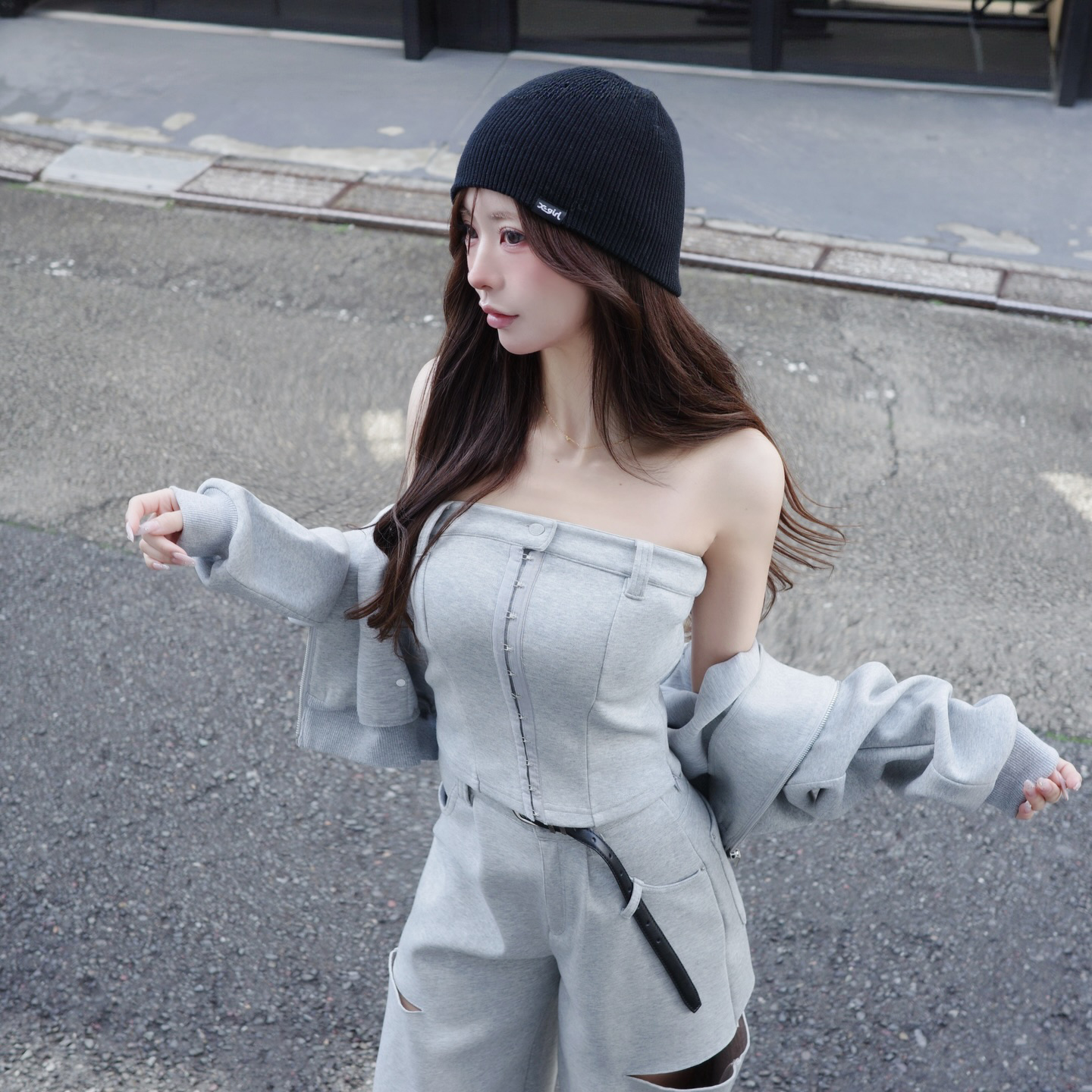立体感のあるスウェット素材で仕立てた、ショートフーディー×ベアトップのアンサンブル。