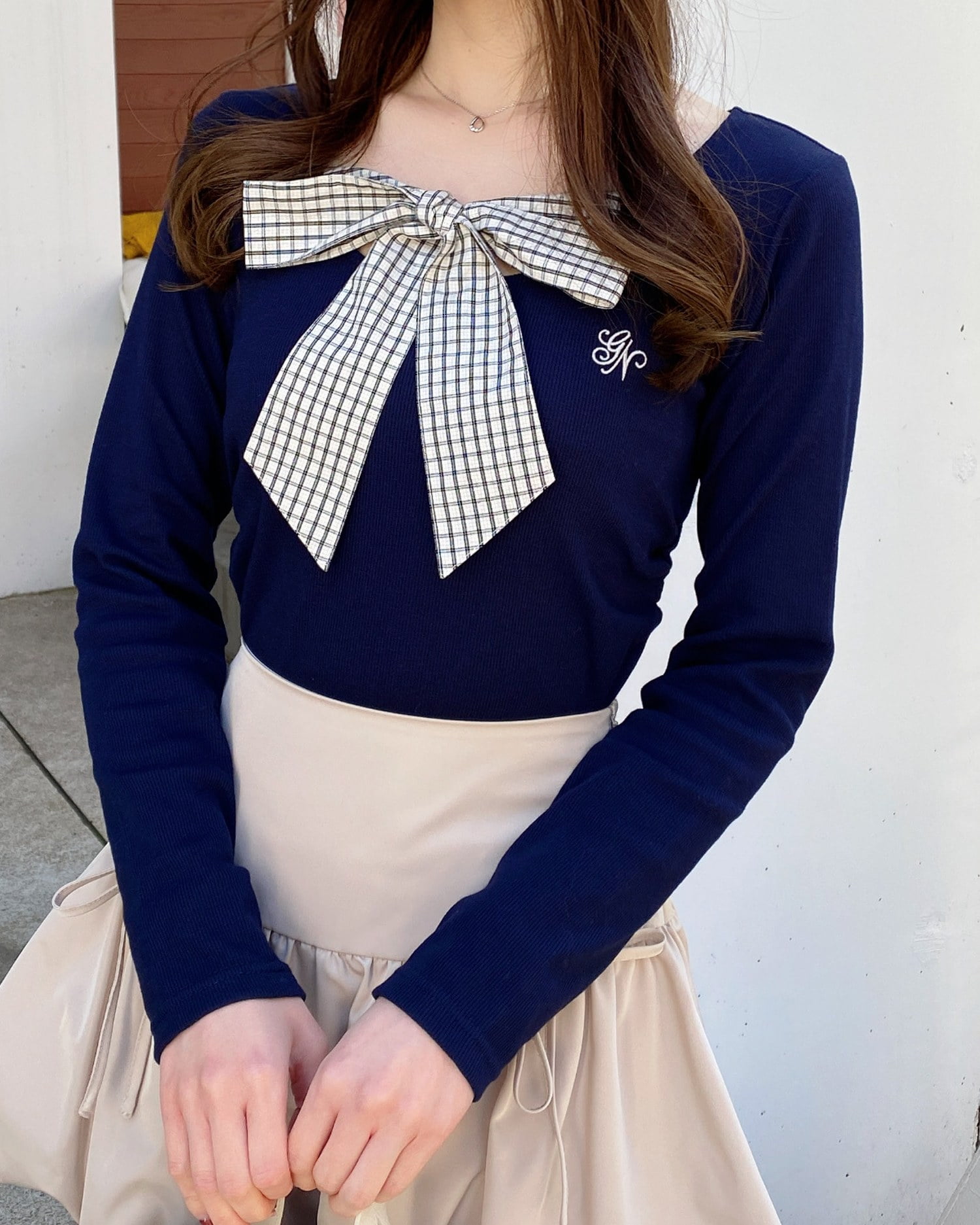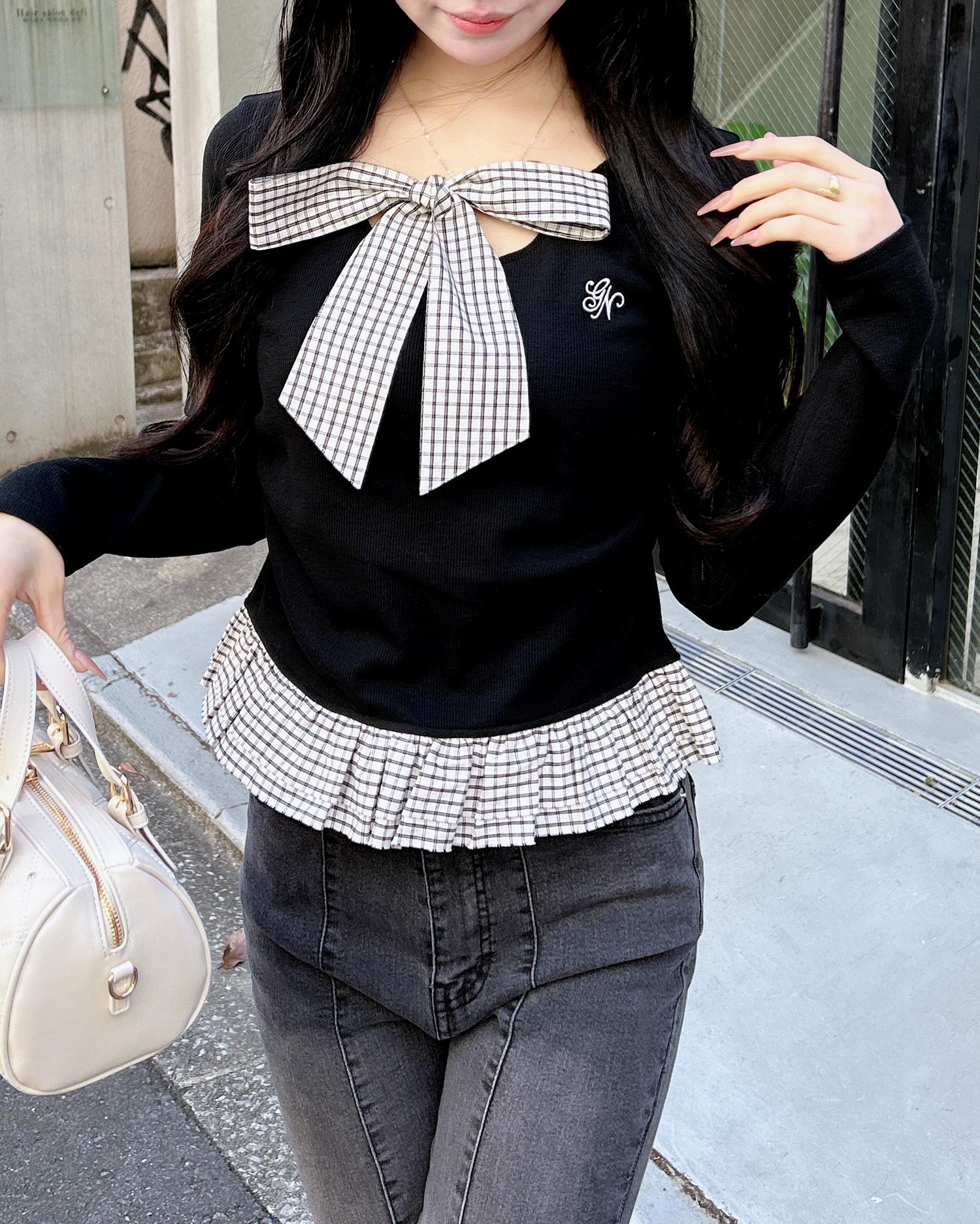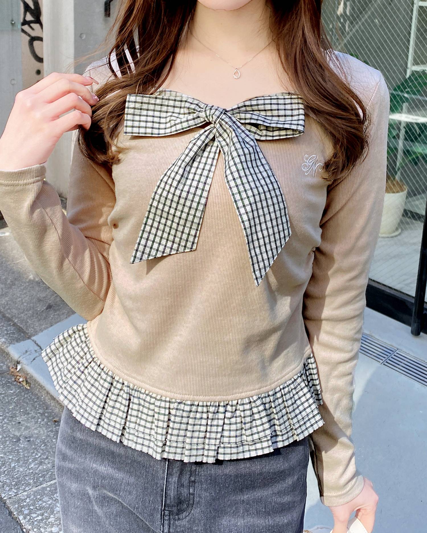 ⚫︎1261-100209 チェックリボンレイヤードトップス