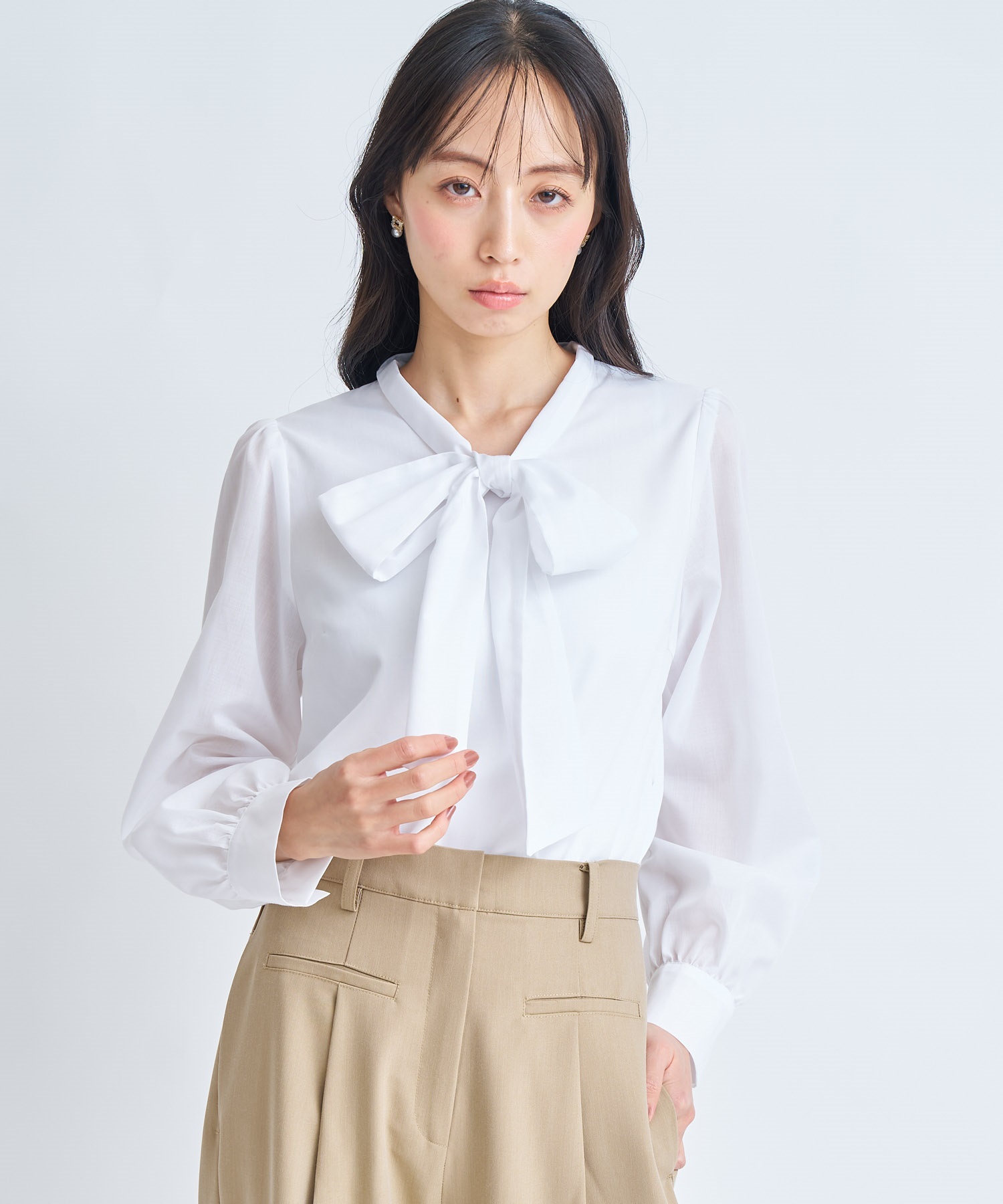 大きめのボウタイリボンが視線を惹く、華やかなデザインブラウス。