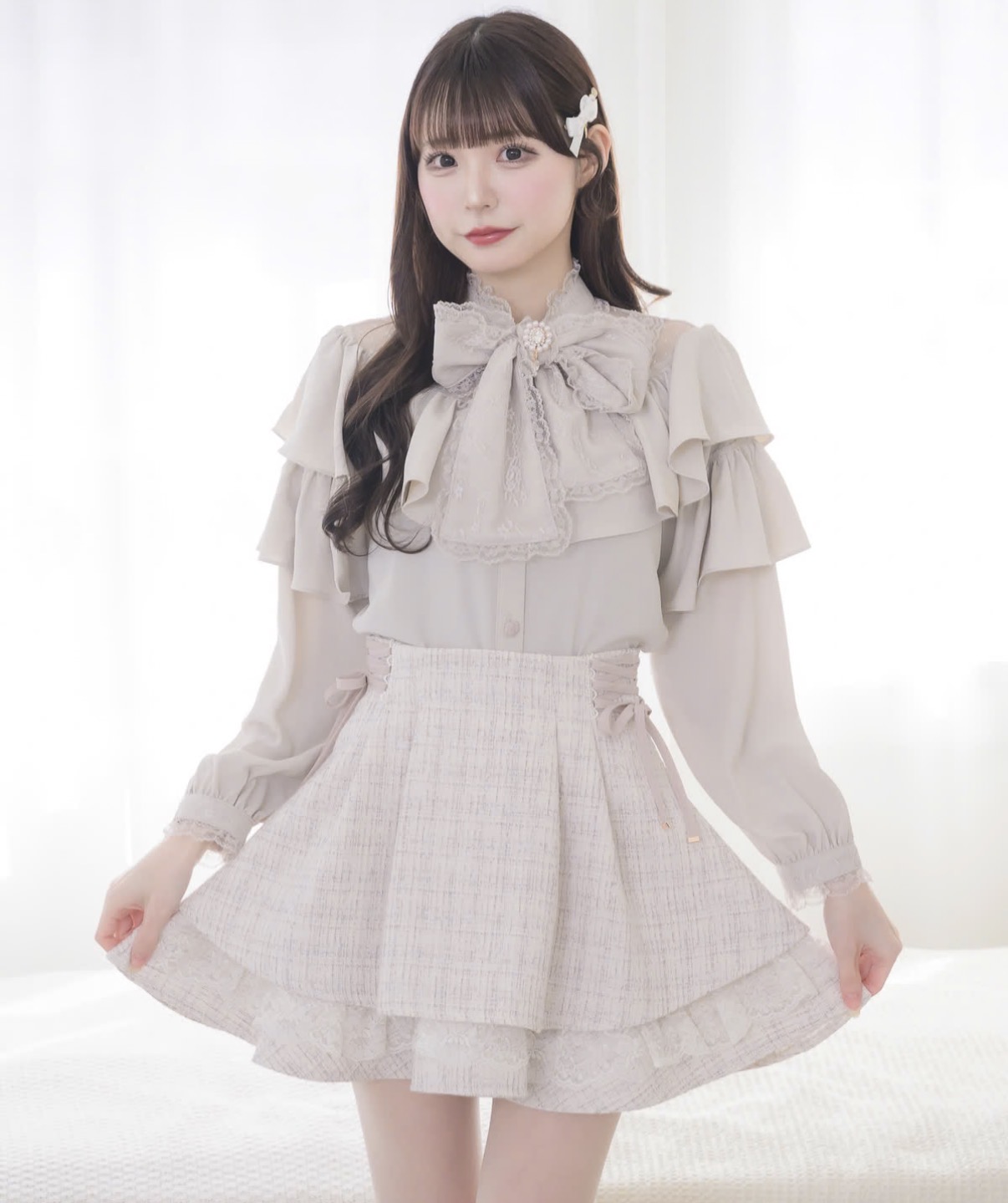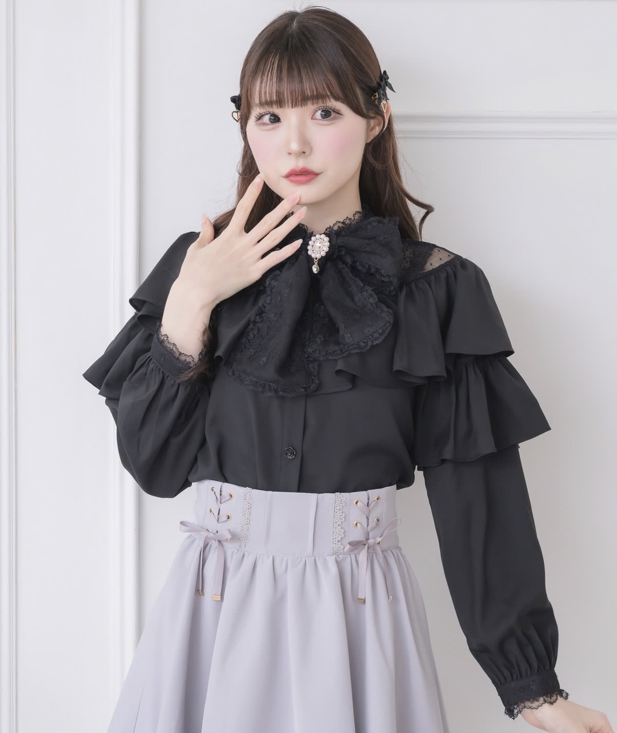 袖コンシャスなデザインブラウス♡デコルテ部分には透け感を取り入れ、ちょうどストラップ部分にレースラインが入っているのもポイント。テロンとした柔らかい生地感が、女性らしい落ち感を演出します。ボウタイリボンが上品さを添え、知的でお育ち感のある雰囲気に♪