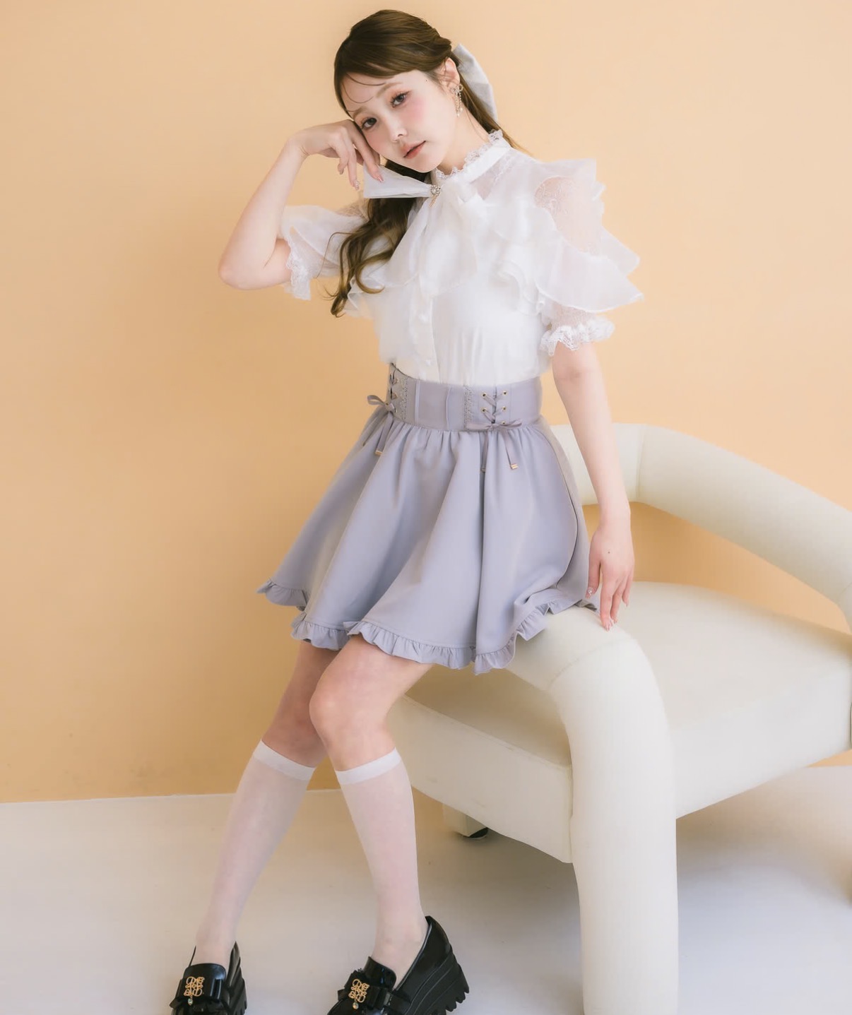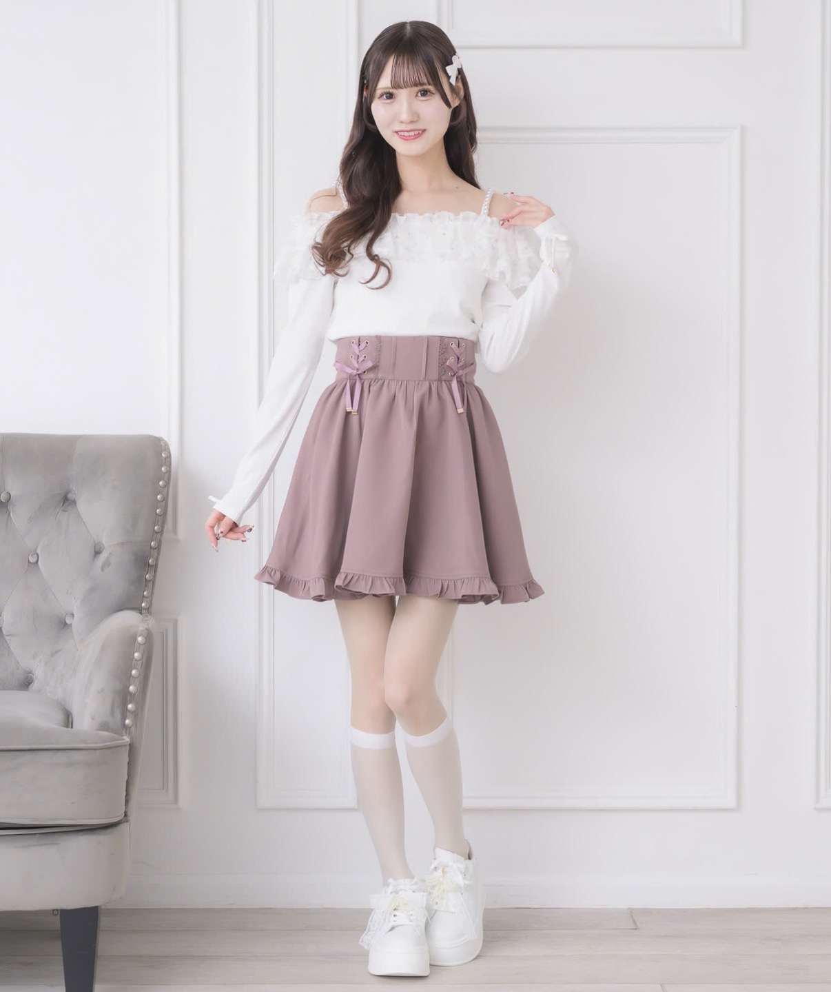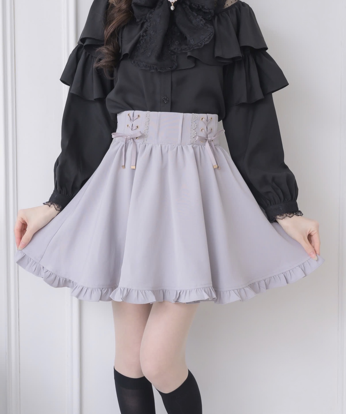 シンプルなワンカラーでコーディネートしやすく、程よい丈感がさりげなく脚を引き立てる一枚。フロントのレースアップが視線を集め、さりげないアクセントとしてスタイリングを引き締めてくれるデザイン。フレアラインが女性らしいシルエットを作り、着こなしに華やかなニュアンスをプラス。