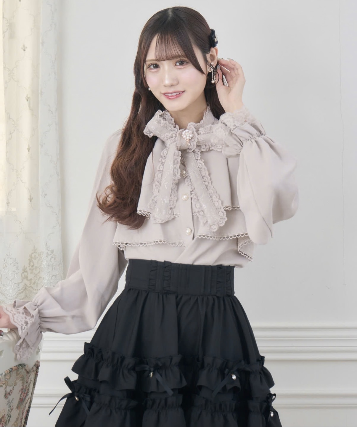 ふんわりとした2段ティアードが可愛らしいブラウス♡ヘムラインにはピコレースをあしらい、繊細で上品な印象に。細身でスッキリとしたボウタイリボンにはレースを重ね、華やかさをプラス。鎖骨の中心は控えめなVカットで、抜け感のある女性らしい雰囲気を演出します。