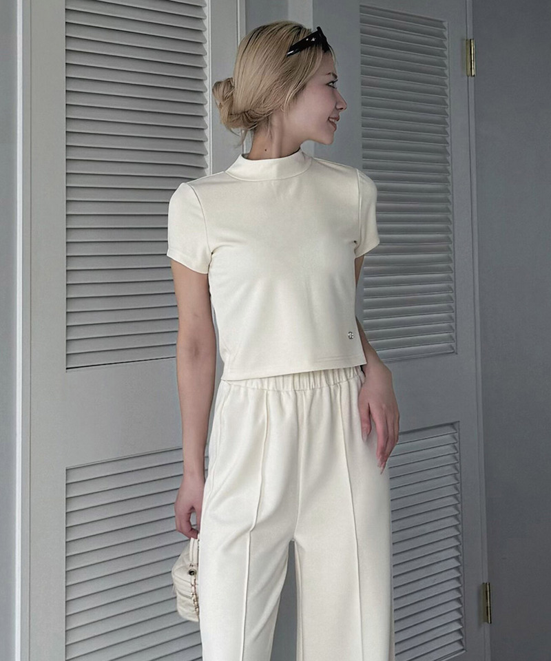 カットソー素材ながらもきれいめな印象を与えてくれる、コンパクトシルエットのプチハイネック半袖トップス。