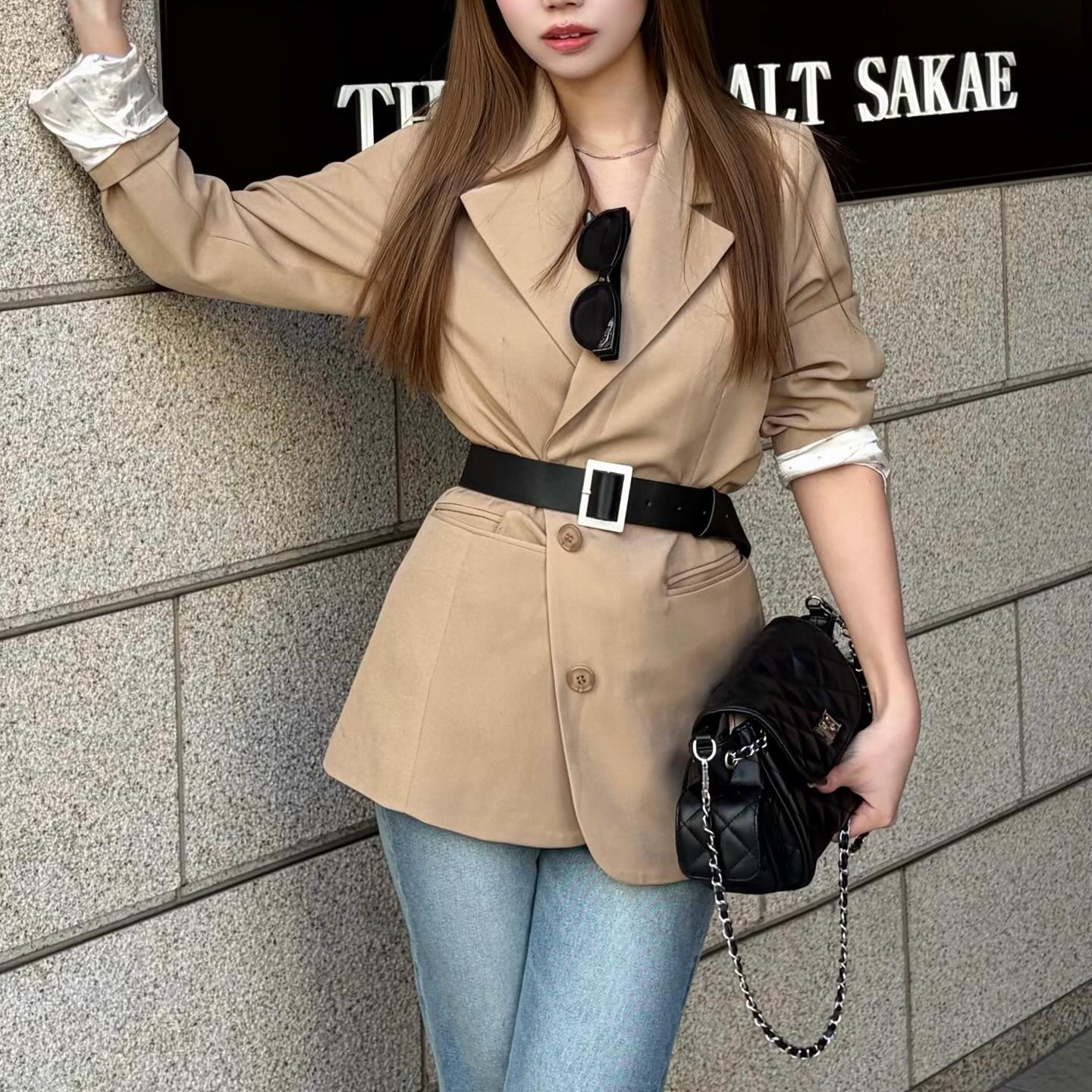 付属のベルトで自然なくびれを演出し、女性らしいメリハリのあるシルエットに♡取り外し可能な肩パットで、顔まわりをすっきり見せてくれるのもポイント◎