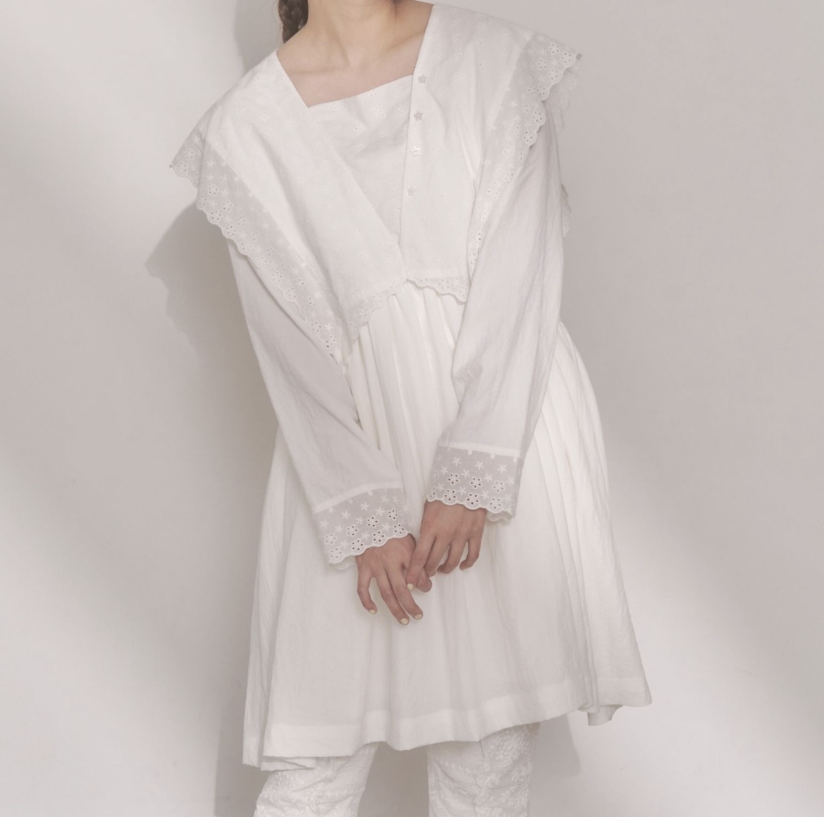 襟にはコットンレースを使用し、甘さと繊細さをプラス。