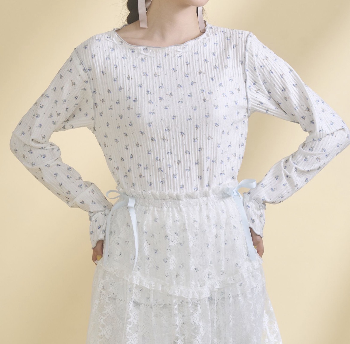 首回りの華奢なリボンは甘すぎずアクセントに〇